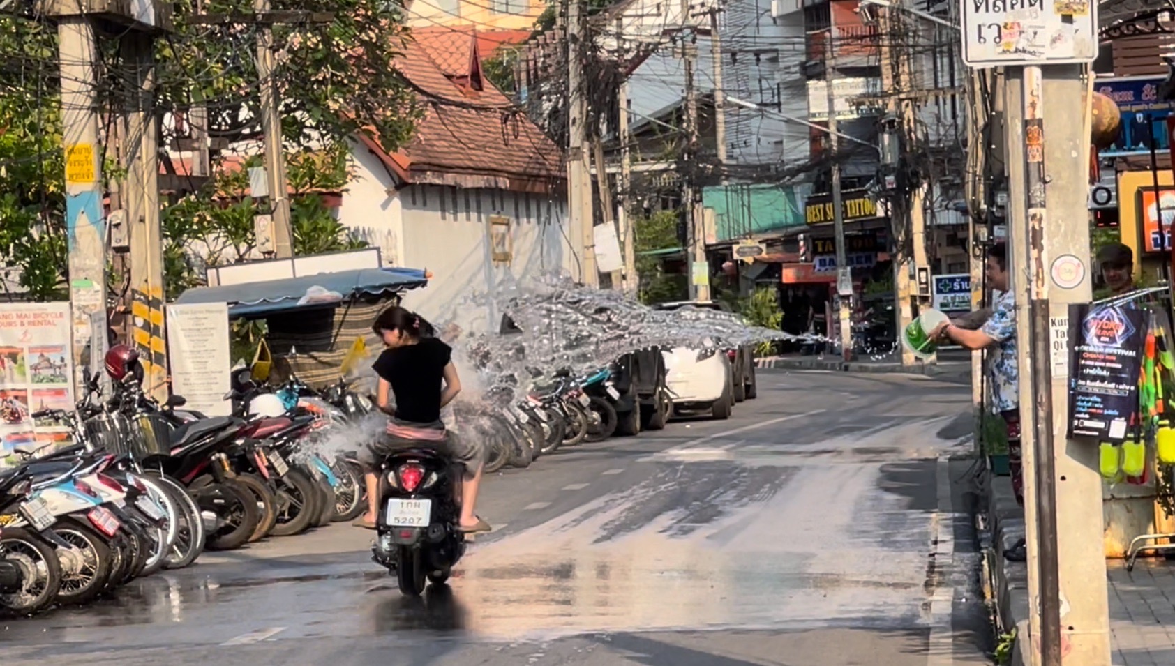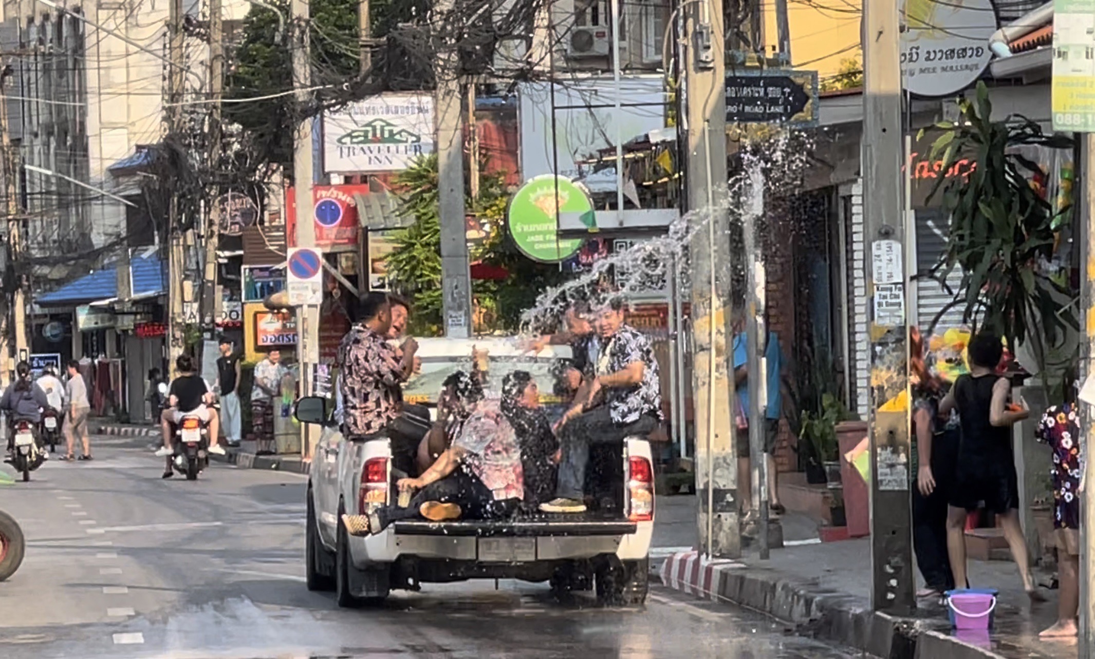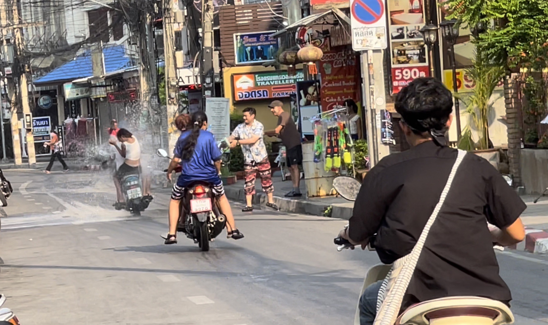 โดยที่บริเวณในซอยลอยเคราะห์ พบว่ามีหลายร้านที่ขณะนี้บรรดาหนุ่มสาวและนักท่องเที่ยว พากันออกมาเล่นสาดน้ำภายในซอยดังกล่าว โดยส่วนใหญ่เป็นการสาดน้ำเล่นกันในกลุ่มคนที่ขับรถสัญจรไปมา รวมถึงกลุ่มนักท่องเที่ยวบางส่วนที่อยากเล่นน้ำคลายร้อน แต่บางคนที่ขับรถผ่านหากยังไม่สาดก็ยกมือห้าม ขณะที่บางรายเริ่มขึ้นนั่งบนรถกระบะและขับวนไปตามเส้นทาง เพื่อให้คนที่เล่นสาดน้ำได้สาดน้ำคลายร้อนกันแล้ว