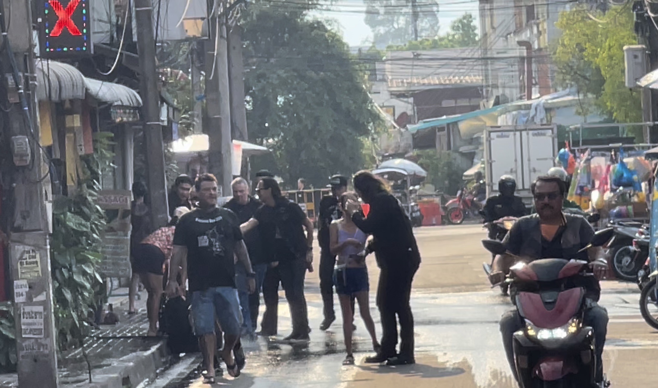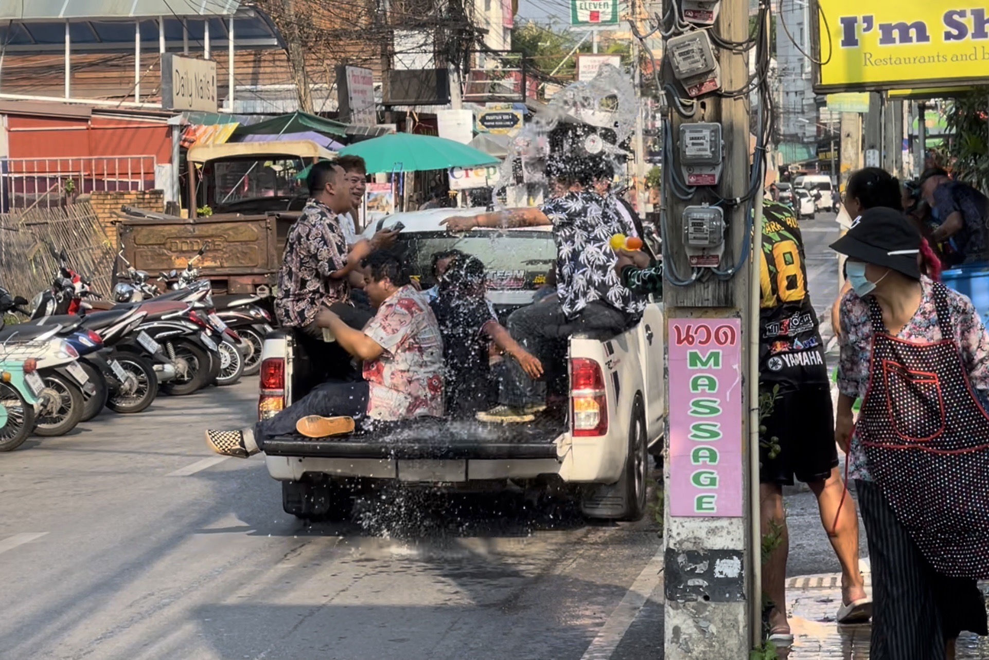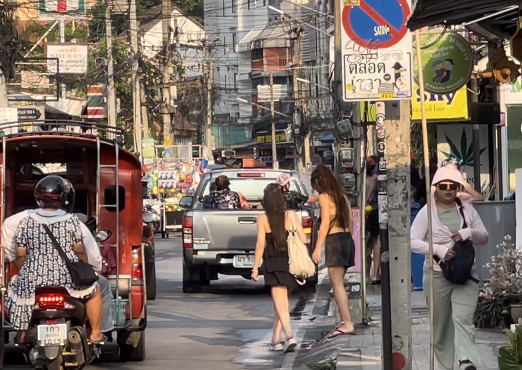โดยที่บริเวณในซอยลอยเคราะห์ พบว่ามีหลายร้านที่ขณะนี้บรรดาหนุ่มสาวและนักท่องเที่ยว พากันออกมาเล่นสาดน้ำภายในซอยดังกล่าว โดยส่วนใหญ่เป็นการสาดน้ำเล่นกันในกลุ่มคนที่ขับรถสัญจรไปมา รวมถึงกลุ่มนักท่องเที่ยวบางส่วนที่อยากเล่นน้ำคลายร้อน แต่บางคนที่ขับรถผ่านหากยังไม่สาดก็ยกมือห้าม ขณะที่บางรายเริ่มขึ้นนั่งบนรถกระบะและขับวนไปตามเส้นทาง เพื่อให้คนที่เล่นสาดน้ำได้สาดน้ำคลายร้อนกันแล้ว