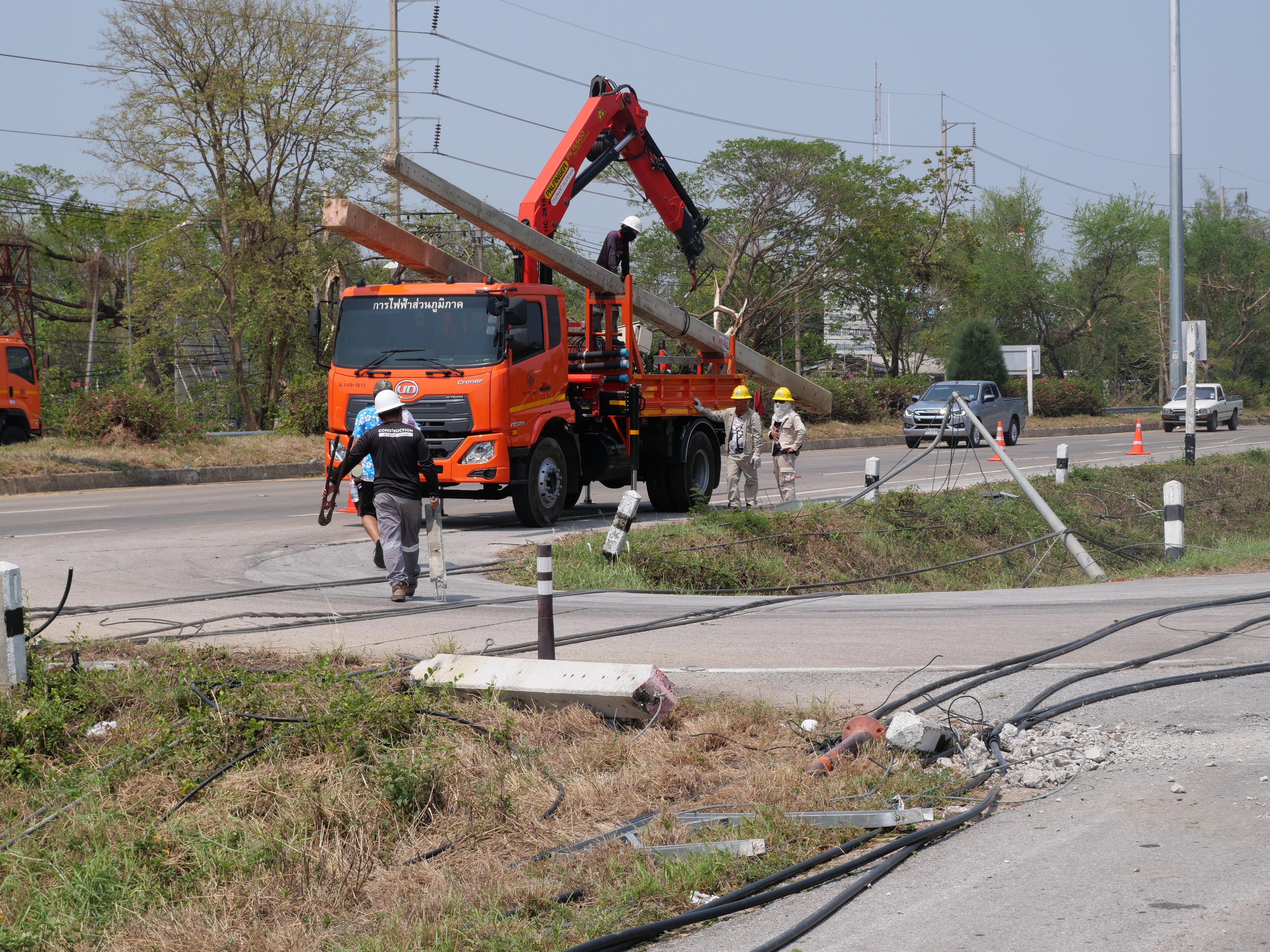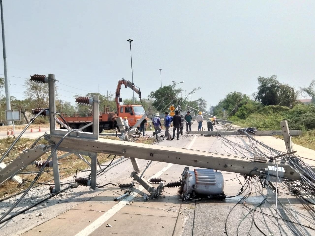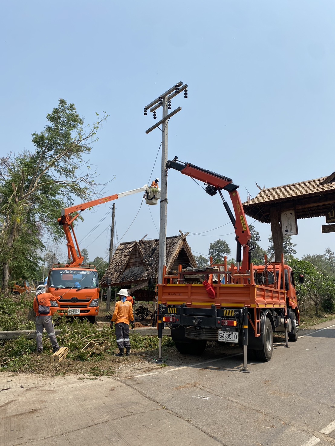 PEA เร่งกู้ระบบจำหน่ายที่ได้รับความเสียหายจากพายุฤดูร้อน ทำให้ไฟดับบริเวณถนนพหลโยธิน อำเภอเมือง จังหวัดลำปาง