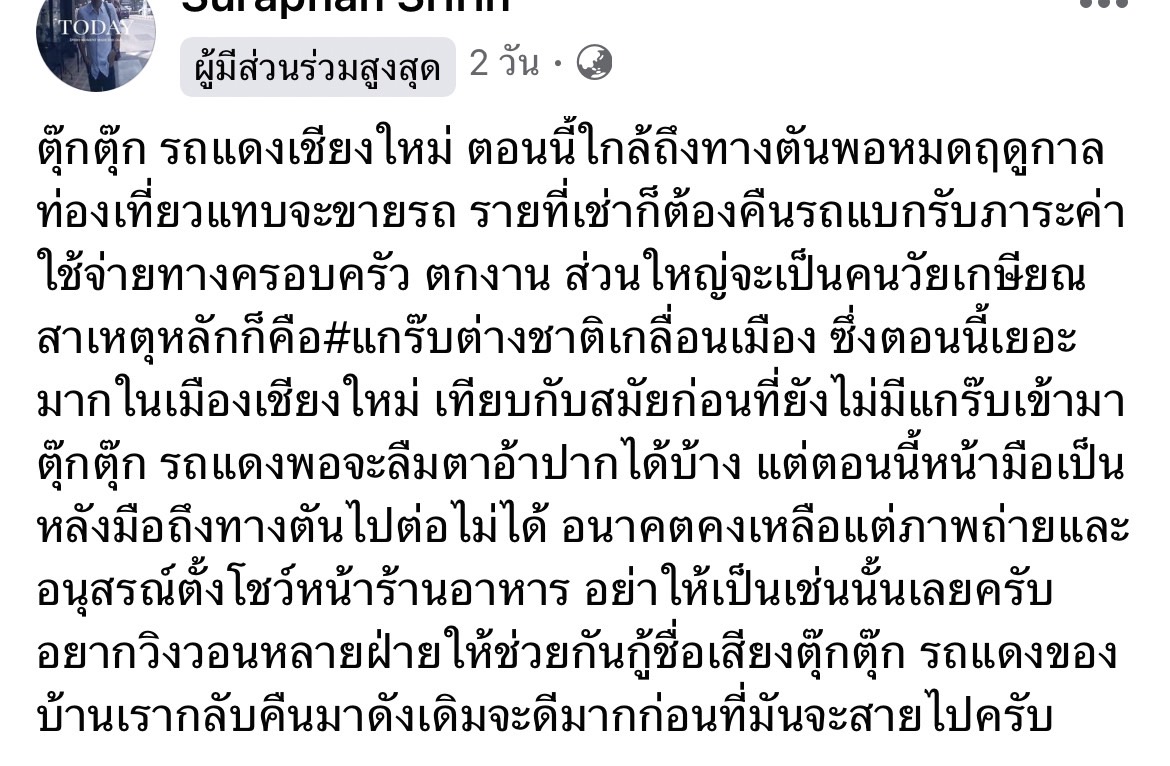 บอกอีกว่า สาเหตุหลักก็คือ #แกร๊บต่างชาติเกลื่อนเมือง ซึ่งตอนนี้เยอะมากในเมืองเชียงใหม่ เทียบกับสมัยก่อนที่ยังไม่มีแกร๊บเข้ามาตุ๊กตุ๊ก รถแดงพอจะลืมตาอ้าปากได้บ้าง แต่ตอนนี้หน้ามือเป็นหลังมือถึงทางตันไปต่อไม่ได้ อนาคตคงเหลือแต่ภาพถ่ายและอนุสรณ์ตั้งโชว์หน้าร้านอาหาร อย่าให้เป็นเช่นนั้นเลยครับ