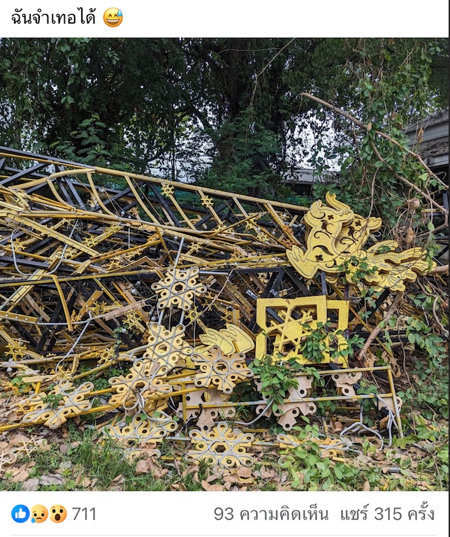 วันนี้ (17 พ.ค.67) โซเชียลแชร์กันสนั่น เมื่อบังเอิญมีผู้ใช้เฟสบุ๊กรายหนึ่ง เผยภาพซากแห่งความสุข เป็นโครงไฟต่างๆ คล้ายคุ้นกับที่เคยเห็นในช่วงเทศกาล แต่ใช่หรือไม่ ก็คงต้องใช้สายตาเทียบกันเอาเองว่าคุ้นหรือไม่