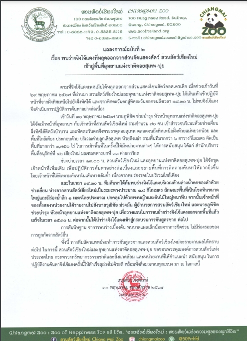 แถลงการณ์ฉบับที่ 2 เรื่อง พบร่างจิงโจ้แดงที่หลุดออกจากส่วนจัดแสดงสัตว์ สวนสัตว์เชียงใหม่เข้าสู่พื้นที่อุทยานแห่งชาติดอยสุเทพ-ปุย