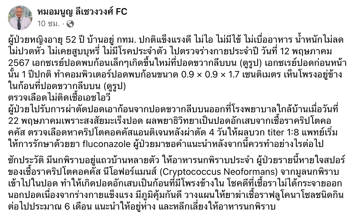 หมอมนูญ เผยเคส ผู้ป่วยหญิง ชอบให้อาหาร นกพิราบ หายใจเอาเชื้อราจากมูลนกเข้าไป ทำปอดอักเสบ เป็นก้อนที่มีโพรงข้างใน โชคดีไม่กระจายออกนอกปอด