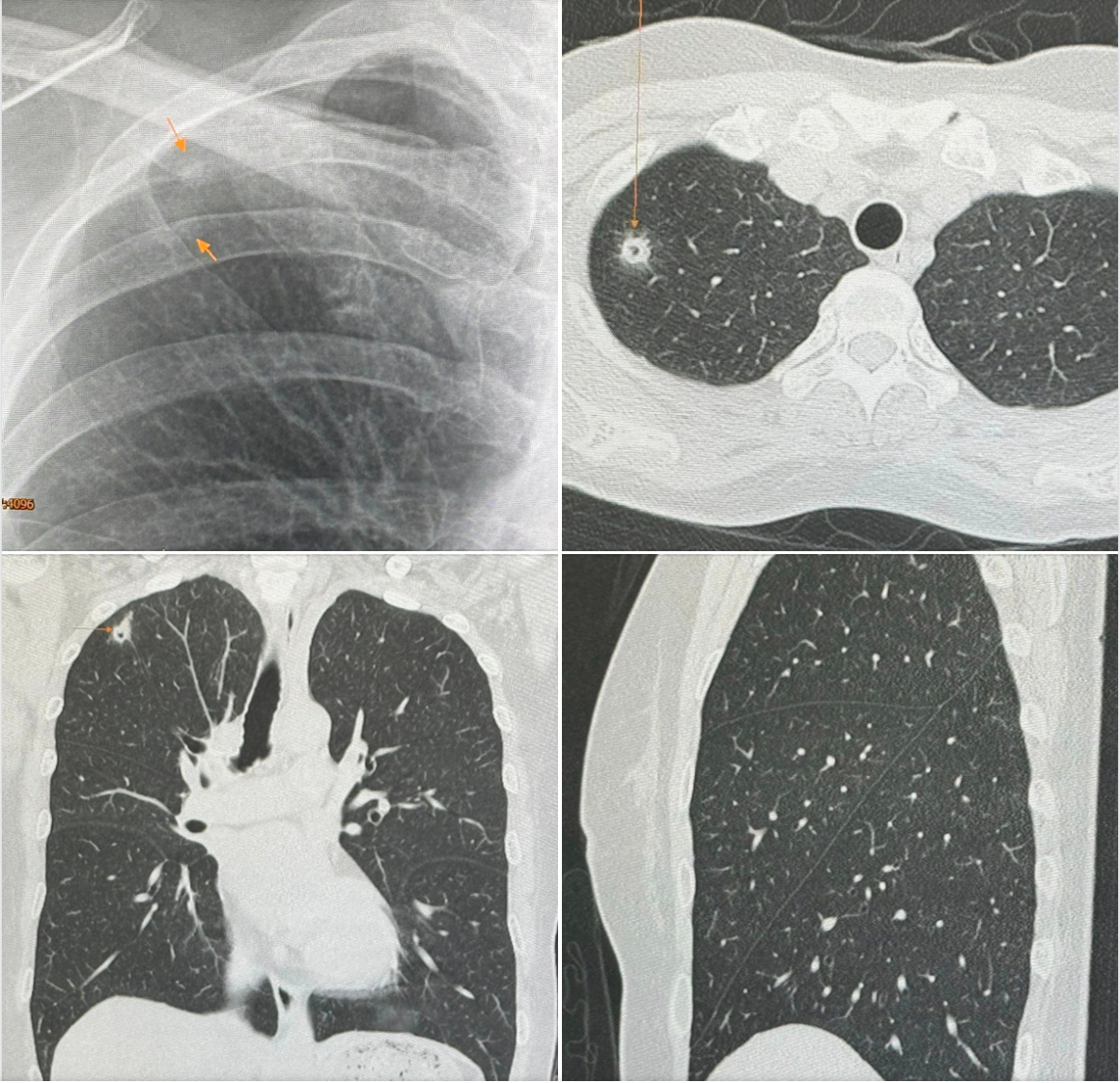 ไปตรวจร่างกายประจำปี วันที่ 12 พฤษภาคม 2567 เอกซเรย์ปอดพบก้อนเล็กๆเกิดขึ้นใหม่ที่ปอดขวากลีบบน เอกซเรย์ปอดก่อนหน้านั้น 1 ปีปกติ ทำคอมพิวเตอร์ปอดพบก้อนขนาด 0.9 × 0.9 × 1.7 เซนติเมตร เห็นโพรงอยู่ข้างในก้อนที่ปอดขวากลีบบน ตรวจเลือดไม่ติดเชื้อเอชไอวี