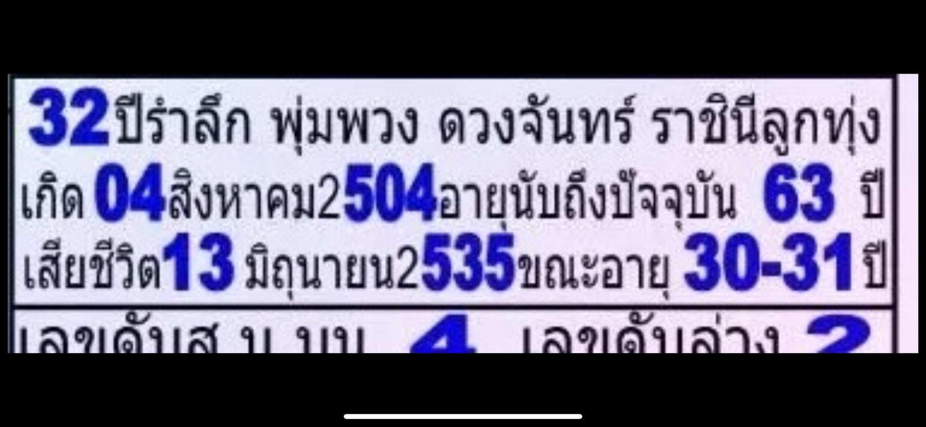 เมื่อเวลา 18.00 น.วันที่ 16 มิ.ย.2567 จากการเปิดเผยจาก นางสาวพัทธนันท์ แก้วมาลา หรือ“มิกิ”แม่ค้าน้ำม่วงปั่น ชุดไทยเซ็กซี่ ว่า ได้ถูกเลขของ พุ่มพวง ท้าย 2 ตัว 31 จำนวน 3 ใบดีใจมาก แม่พุ่มพวง ท่านเสียชีวิตเมื่อวันที 13 มิย ตอนท่านเสียชีวิตท่านอายุ 30-31 ปี ตนได้หาซื้อเลข 13,31 30 มาโดยตลอด แต่ไม่ทันเกลี้ยงแผง