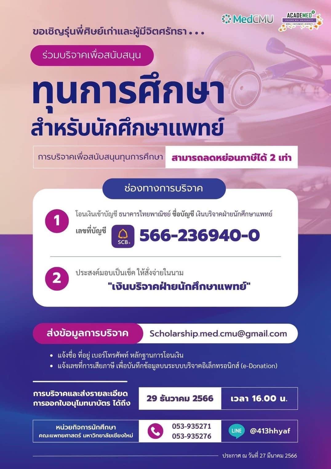 ชื่อบัญชี ” เงินบริจาคฝ่ายนักศึกษาแพทย์ ”ธนาคารไทยพาณิชย์ สาขาคณะแพทยศาสตร์ มหาวิทยาลัยเชียงใหม่ เลขที่บัญชี 566-236940-0