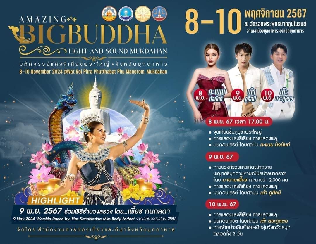 เมื่อวันที่ 8 พฤศจิกายน 2567 เวลา 17.00 น. นายวรญาณ บุญณราช ผู้ว่าราชการจังหวัดมุกดาหาร เป็นประธานจัดกิจกรรมจังหวัดมุกดาหารจะจัดกิจกรรมงาน แสงสีเสียงพระใหญ่ Amazing Bigbuddha Light and Sound Mukdahan ส่งเสริมการท่องเที่ยวตลาดและประชาสัมพันธ์กลุ่มจังหวัดสนุก ส่งเสริมการท่องเที่ยวตลาดและประชาสัมพันธ์กลุ่มจังหวัดสนุก เที่ยวสนุก สุขสบาย เพื่อส่งเสริมการท่องเที่ยวเชิงวัฒนธรรมและกระตุ้นเศรษฐกิจท้องถิ่น โดยเริ่มกิจกรรมด้วยพิธีจุดเทียนขึ้นภูบูชาพระใหญ่ การแสดงแสงสีเสียงเล่าขานตำนานเมืองมุกดาหาร การแสดงพลุ และมินิคอนเสิร์ตจากศิลปินชื่อดัง พร้อมกันนี้มีการออกร้านจำหน่ายสินค้าและอาหารท้องถิ่นจากผู้ประกอบการในจังหวัดตลอดทั้งวัน สร้างความประทับใจและให้ผู้เข้าชมได้รับประสบการณ์การท่องเที่ยวที่หลากหลาย