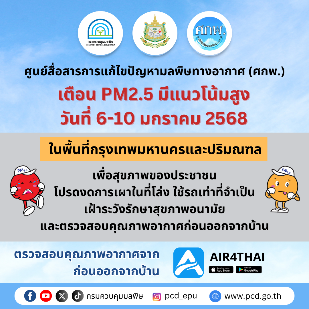 ศูนย์สื่อสารการแก้ไขปัญหามลพิษทางอากาศ (ศกพ.) ขอแจ้งประชาชน ในช่วงสัปดาห์นี้ ระหว่างวันที่ 6-10 มกราคม 2568 สถานการณ์ฝุ่นละอองมีแนวโน้มที่จะขยับสูงขึ้นในพื้นที่กรุงเทพมหานครและปริมณฑล โดยเฉพาะพื้นที่ด้านตะวันตก เนื่องจากมวลอากาศเย็นที่แผ่เข้ามาจากด้านตะวันออกเฉียงเหนือของประเทศ ส่งผลให้อากาศนิ่งและจมตัว ฝุ่นละอองไม่สามารถระบายออกไปจากพื้นที่ได้
