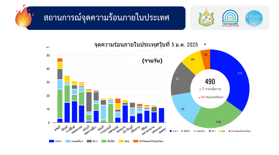 ข้อมูลจุดความร้อน ประจำวันที่ 5 มกราคม 2568 จาก GISTDA ประเทศไทยมีจุดความร้อนทั้งสิ้น 490 จุด มาจาก นาข้าว 171 จุด พื้นที่ป่า 110 จุด เกษตรอื่น 73 จุด อ้อย 44 จุด ข้าวโพด 20 จุด และ อื่นๆ 72 จุด โดยจังหวัดที่มีจุดความร้อนสูงสุด 15 จังหวัด ดังนี้ 1.ลพบุรี 48 จุด 2.ชัยภูมิ 35 จุด 3.กาฬสินธุ์ 31 จุด 4.นครสวรรค์ 30 จุด 5.สระบุรี 25 จุด 6.นครราชสีมา 24 จุด 7.เพชรบูรณ์ 18 จุด 8.กาญจนบุรี 18 จุด 9.ชลบุรี 18 จุด 10.ขอนแก่น 17 จุด 11.ปราจีนบุรี 15 จุด 12.เชียงราย 14 จุด 13.พิจิตร 13 จุด 14.มหาสารคาม 13 จุด และ 15.นครนายก 11 จุด ซึ่ง ศกพ.ได้ประสานกับหน่วยงานและจังหวัด ขอให้ติดตามควบคุมการเผาอย่างเคร่งครัด
