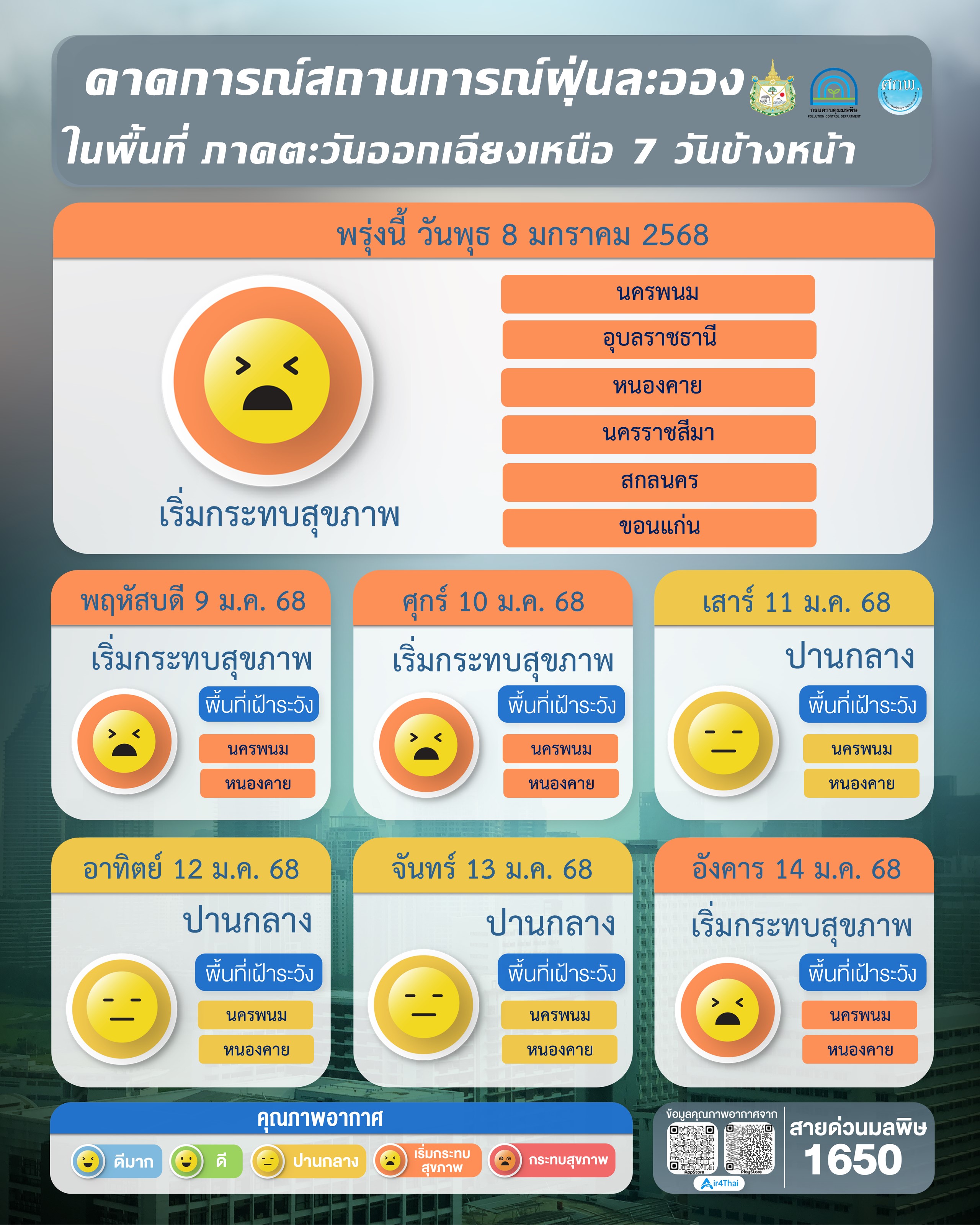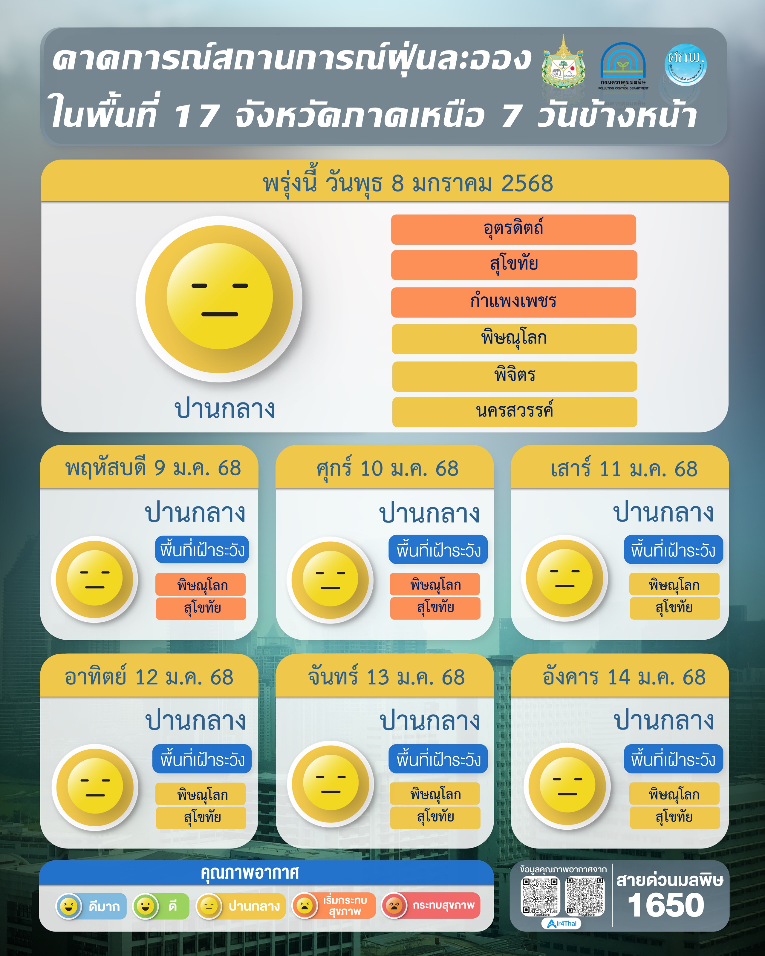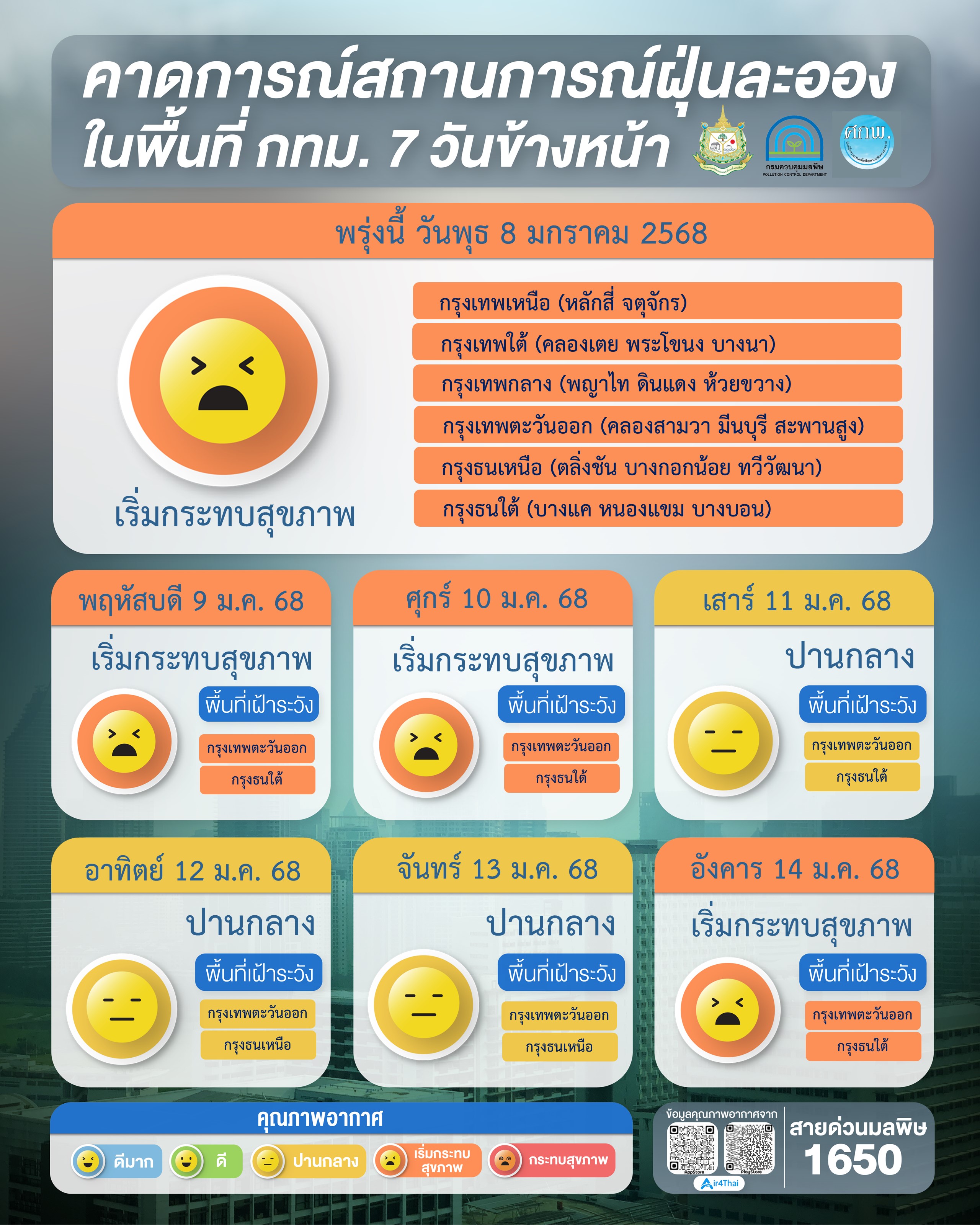 -> ประชาชนทั่วไป : ควรเฝ้าระวังสุขภาพ ลดเวลาการทำกิจกรรมกลางแจ้ง หรือใช้อุปกรณ์ป้องกันตนเอง