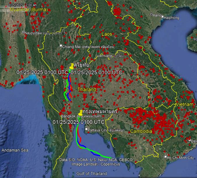 ปัจจัยทางด้านอุตุนิยมวิทยายังคงส่งผลต่อการระบายของฝุ่นละออง อิทธิพลของมวลอากาศเย็นที่ยังคงปกคลุมประเทศไทย ส่งผลให้อากาศนิ่งและจมตัว ร่วมกับการพบเจอค่าอัตราการระบายอากาศที่ต่ำ การเกิดสภาพอุณหภูมิผกผันใกล้ผิวพื้น สภาพเพดานการลอยตัวอากาศที่ต่ำมาก เกิดลักษณะคล้ายฝาชีครอบ ส่งผลให้ฝุ่นละอองไม่สามารถระบายออกจากพื้นที่ได้ จึงมีการสะสมและแขวนลอยในชั้นบรรยากาศมาก ข้อมูลจาก GISTDA ประเทศไทยยังพบเจอจุดความร้อนในหลายพื้นที่ของภาคตะวันออกเฉียงเหนือ ภาคตะวันออก ภาคกลาง/ตะวันตก ภาคเหนือตอนล่าง วันที่ 24 มกราคม 2568 พบจุดความร้อนทั้งสิ้น 420 จุด