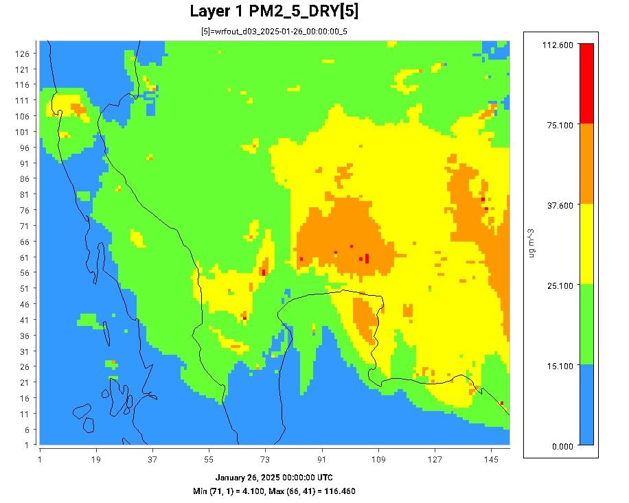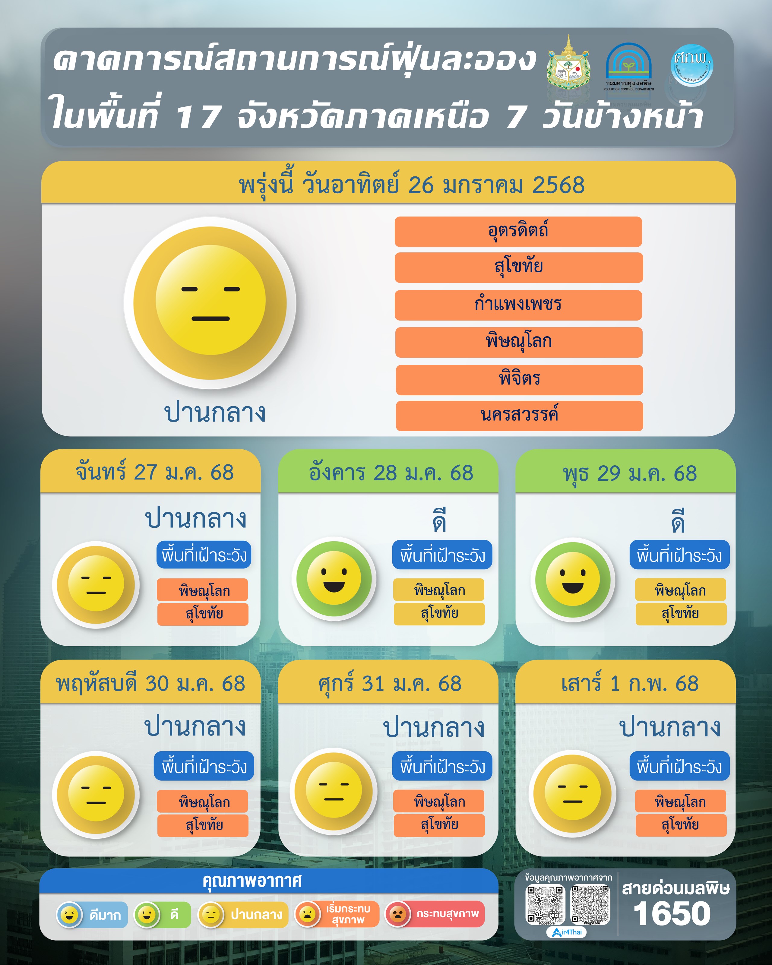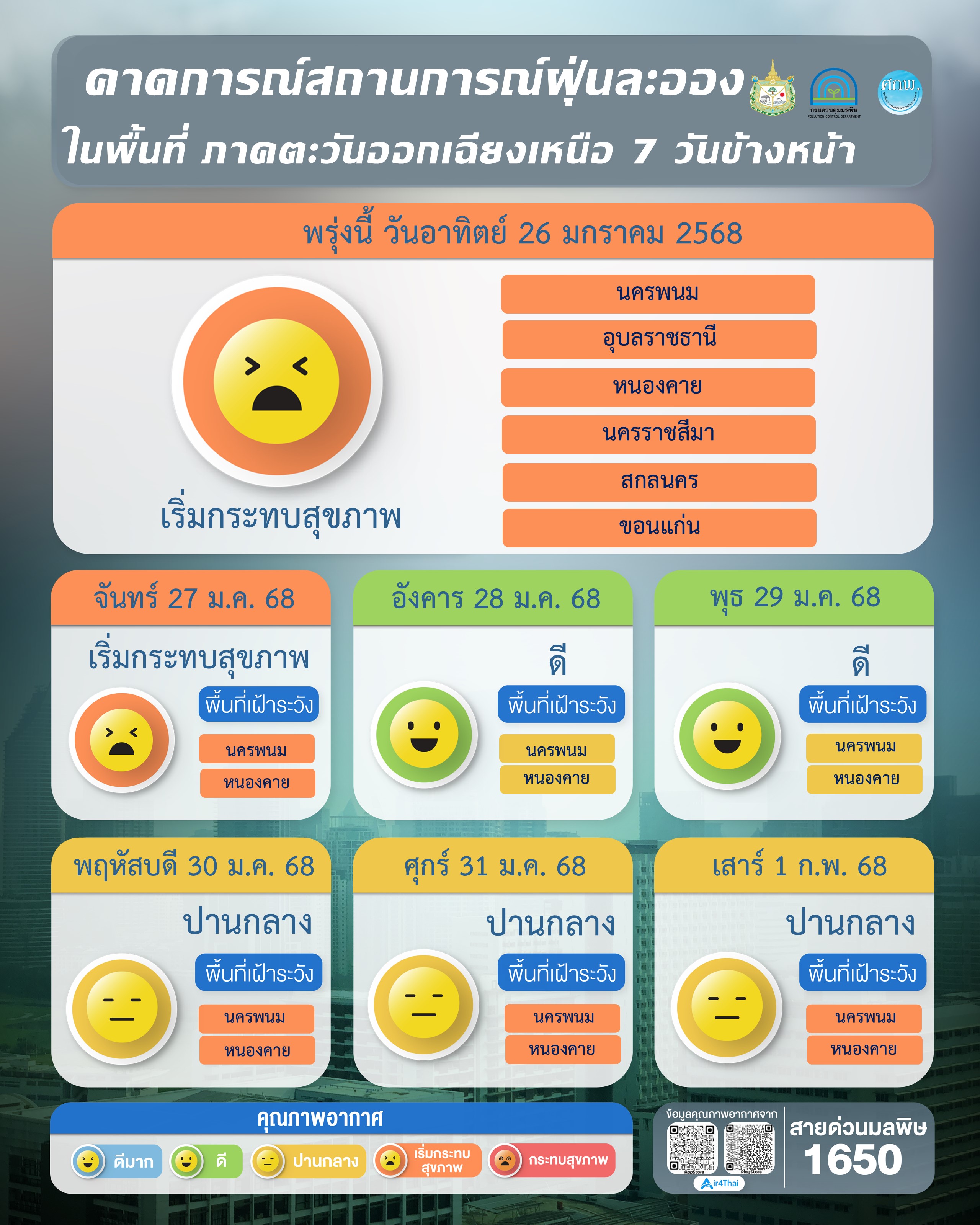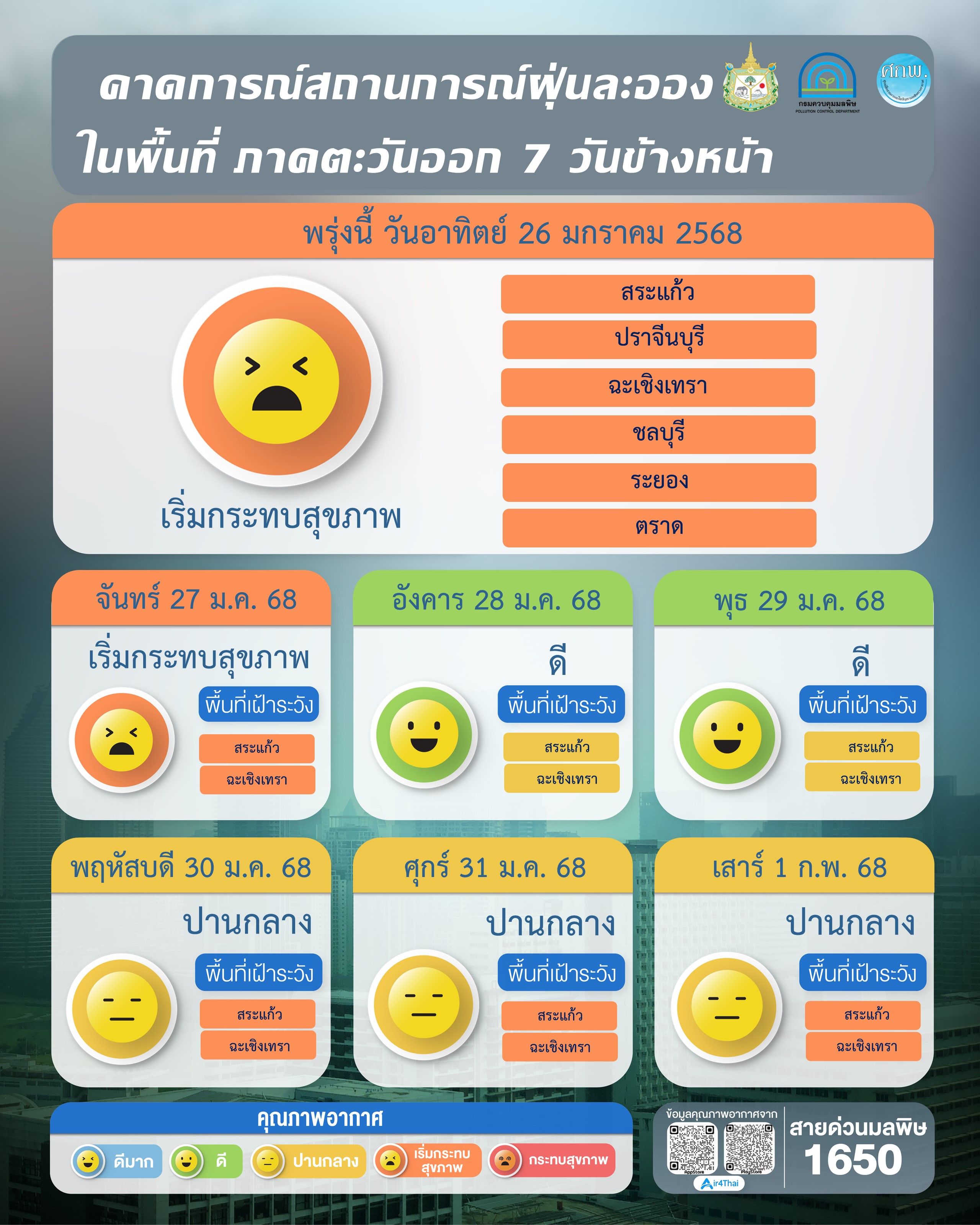 ศกพ. ขอย้ำการคาดการณ์สถานการณ์ฝุ่นละออง PM2.5 ระหว่างวันที่ 25 – 27 มกราคม 2568 ยังคงมีแนวโน้มเกินเกณฑ์มาตรฐานหลายพื้นที่ โดยเฉพาะอย่างยิ่ง พื้นที่กรุงเทพมหานครและปริมณฑล และพื้นที่อื่นที่ต้องเฝ้าระวังสถานการณ์อย่างใกล้ชิด ได้แก่ พื้นที่ภาคตะวันออกเฉียงเหนือ พื้นที่ภาคเหนือตอนล่าง พื้นที่ภาคตะวันออก และพื้นที่ภาคกลาง/ตะวันตก ทั้งนี้ สถานการณ์จะบรรเทาลงอย่างมีนัยสำคัญหลังวันที่ 27 มกราคม เนื่องจากอัตราการระบายอากาศที่เพิ่มสูงขึ้น ลมที่ค่อนข้างแรง และสภาพอุตุนิยมวิทยาที่เอื้อต่อการระบายฝุ่นละอองมากยิ่งขึ้น