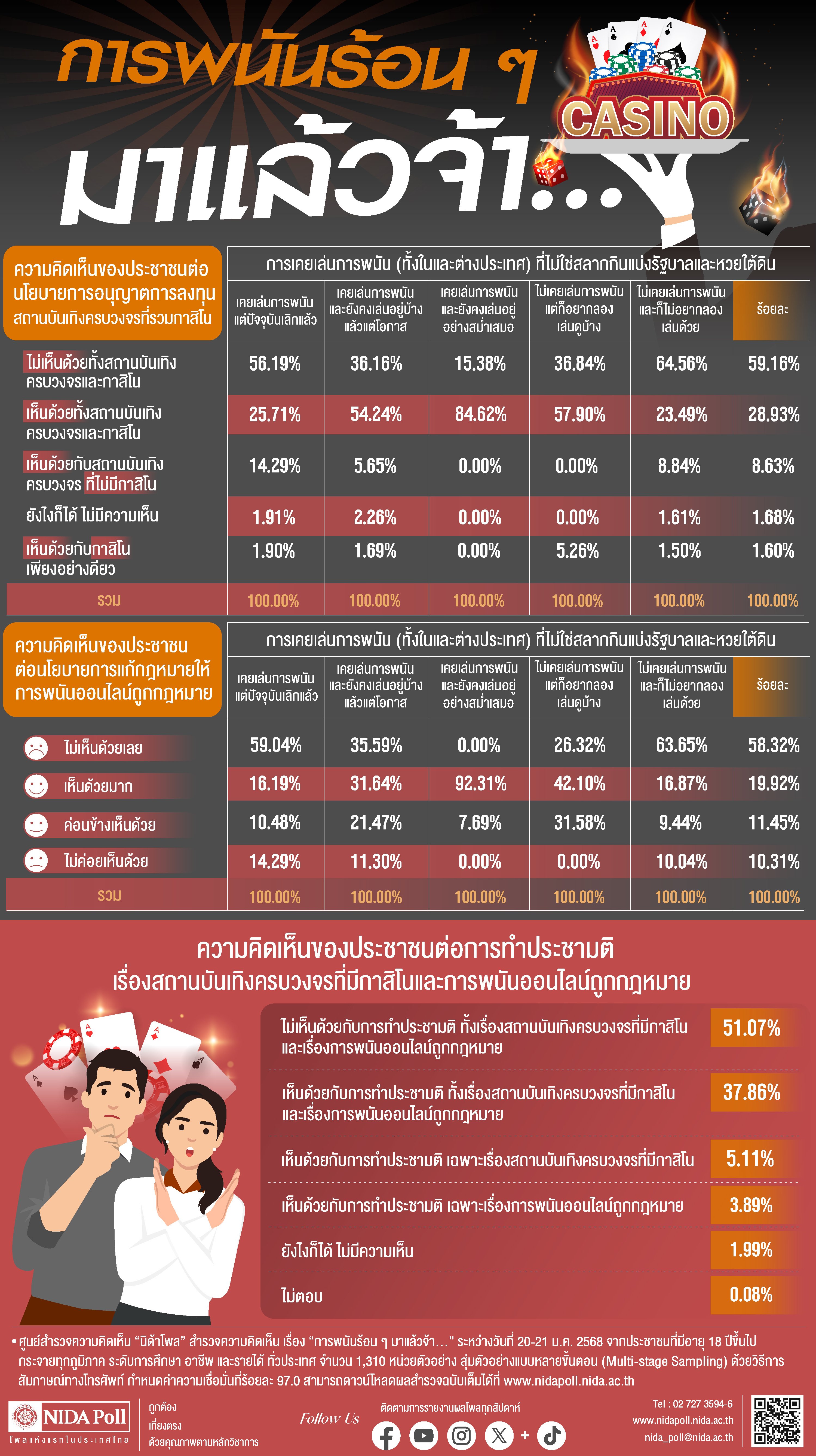 ศูนย์สำรวจความคิดเห็น “นิด้าโพล” สถาบันบัณฑิตพัฒนบริหารศาสตร์ (นิด้า) เปิดเผยผลการสำรวจของประชาชน เรื่อง “การพนันร้อน ๆ มาแล้วจ้า …” ทำการสำรวจระหว่างวันที่ 20-21 มกราคม 2568 จากประชาชนที่มีอายุ 18 ปีขึ้นไป กระจายทุกภูมิภาค ระดับการศึกษา อาชีพ และรายได้ ทั่วประเทศ รวมจำนวนทั้งสิ้น 1,310 หน่วยตัวอย่าง เกี่ยวกับความคิดเห็นของประชาชนที่มีต่อเรื่องสถานบันเทิงครบวงจร (Entertainment Complex) การสำรวจอาศัยการสุ่มตัวอย่างโดยใช้ความน่าจะเป็นจากบัญชีรายชื่อฐานข้อมูลตัวอย่างหลัก (Master Sample) ของ “นิด้าโพล” สุ่มตัวอย่างแบบหลายขั้นตอน (Multi-stage Sampling) เก็บข้อมูลด้วยวิธีการสัมภาษณ์ทางโทรศัพท์ โดยกำหนดค่าความเชื่อมั่น ร้อยละ 97.0