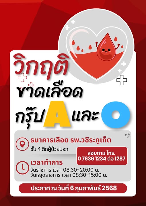 ธนาคารเลือด โรงพยาบาลวชิระภูเก็ต ขาดเลือด กรุ๊ป A และ กรุ๊ป O จำนวนมาก เพื่อใช้รักษาผู้ป่วย วอนผู้มีสุขภาพดีบริจาคโลหิต..