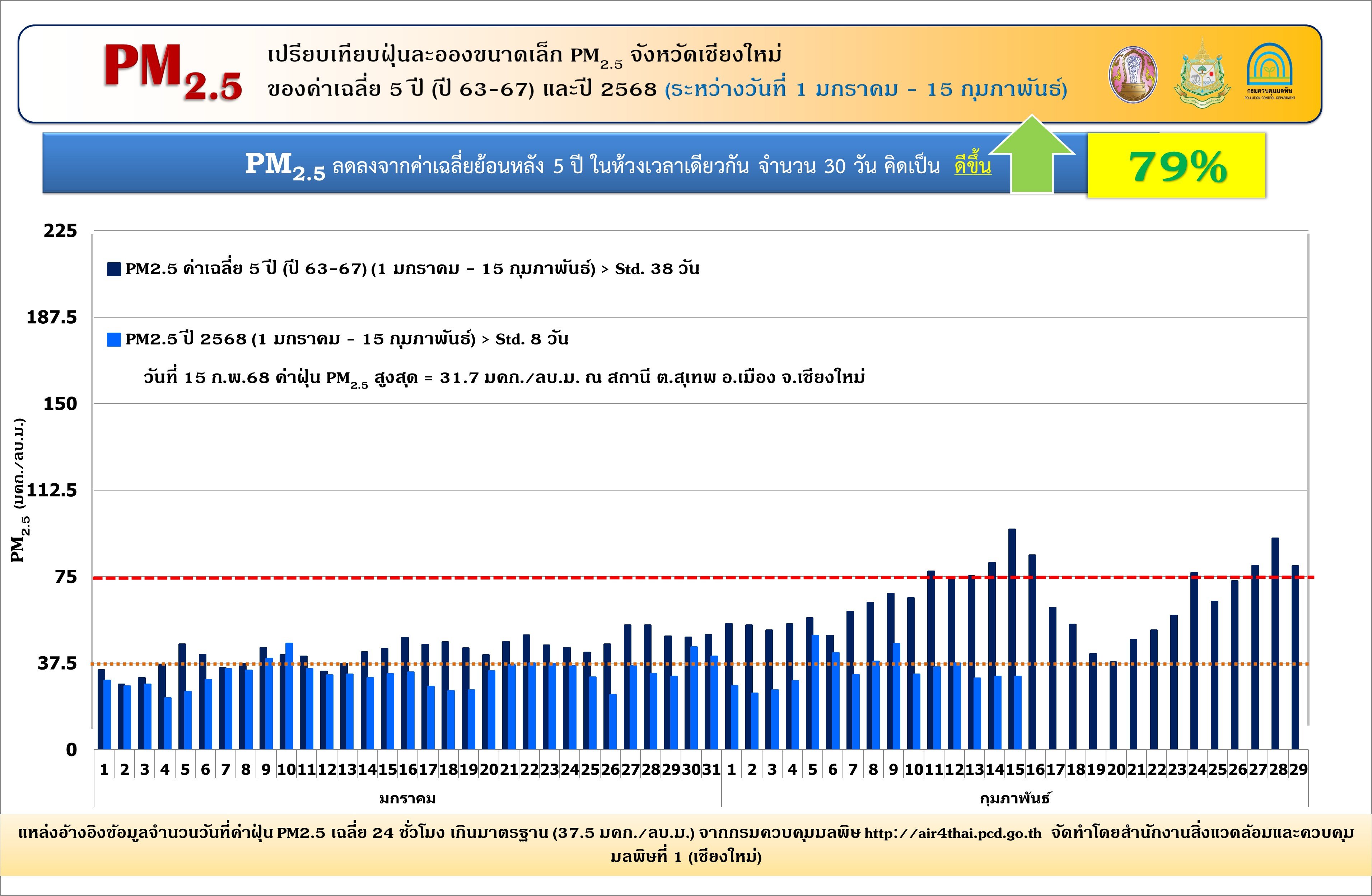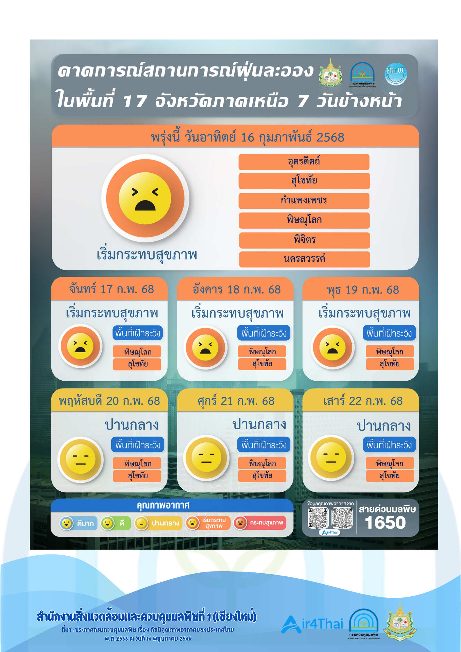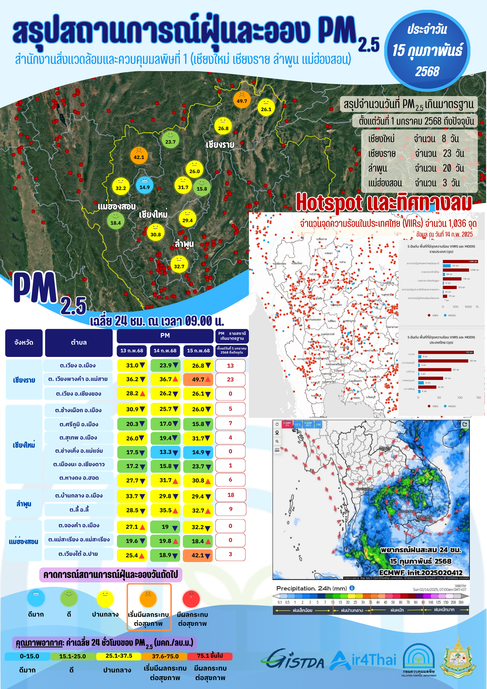📢 สรุปสถานการณ์ฝุ่น PM2.5 ประจำวันที่ 15 กุมภาพันธ์ 2568 ในพื้นที่รับผิดชอบของสำนักงานสิ่งแวดล้อมและควบคุมมลพิษที่ 1 (เชียงใหม่ เชียงราย ลำพูน แม่ฮ่องสอน)