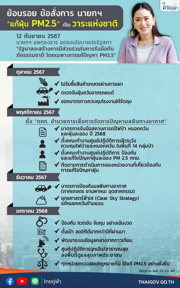 นางสาวแพทองธาร ชินวัตร นายกรัฐมนตรี ติดตามและสั่งการ แก้ปัญหา PM2.5 ฝุ่นควันอย่างใกล้ชิด ระดมกำลังทุกหน่วยงาน เดินหน้าทุกมาตรการแก้ฝุ่นควัน โดยมีการออกมาตรการในช่วงเดือน พฤศจิกายน 2567 – มกราคม 2568 กำหนดเขตห้ามรถบรรทุกเข้ากรณีค่าฝุ่นเกินมาตรฐาน
