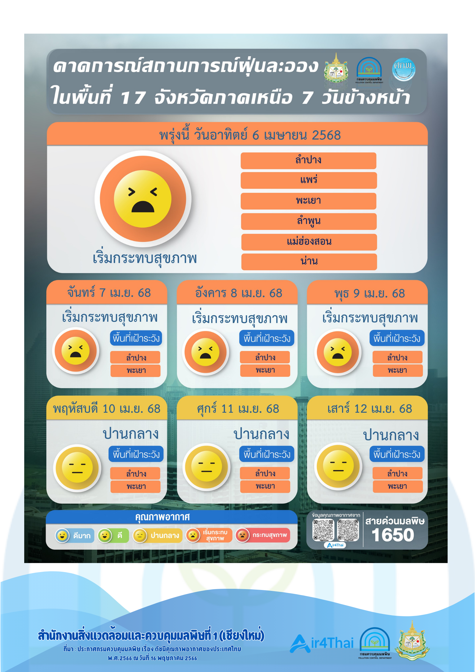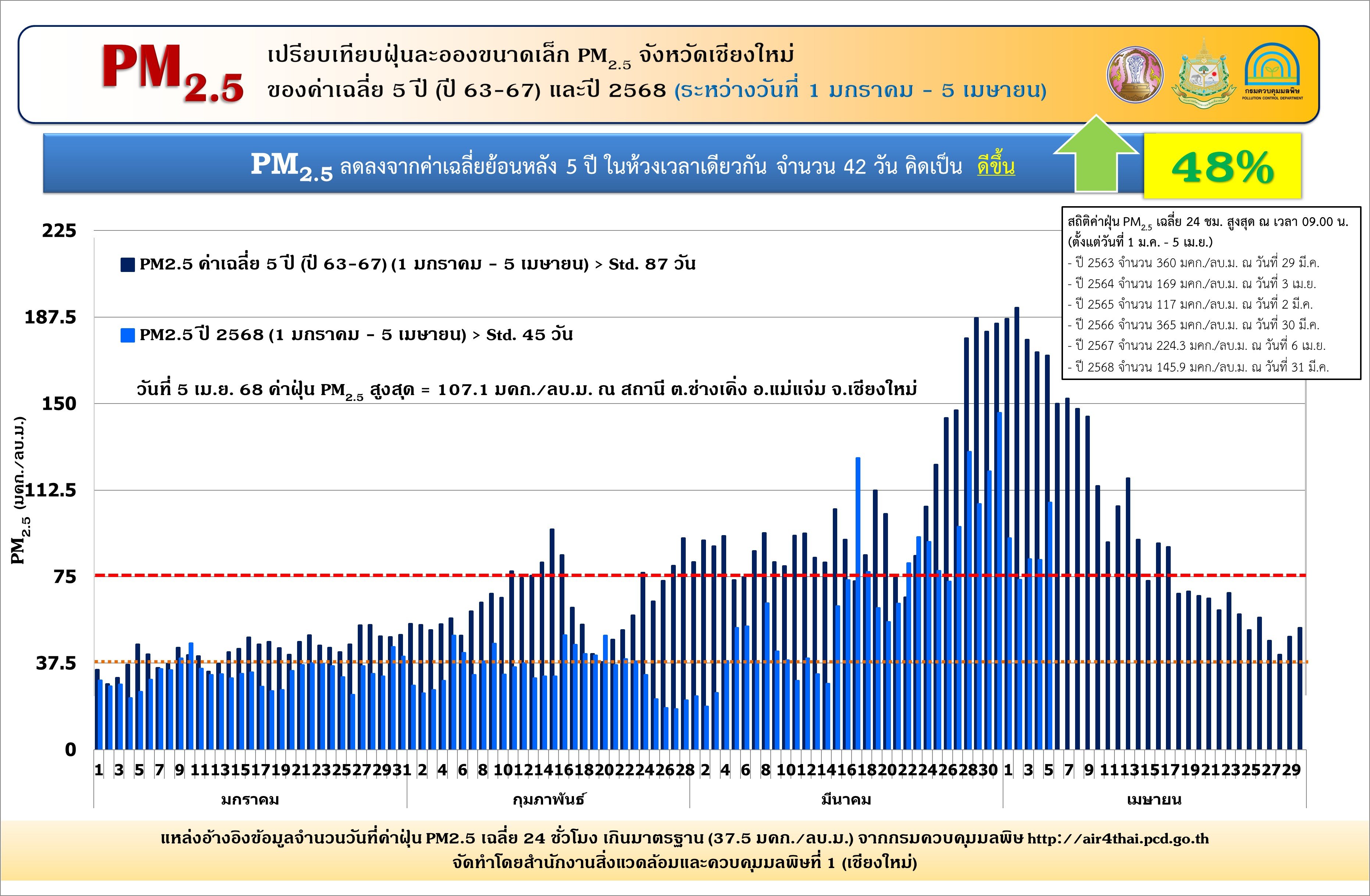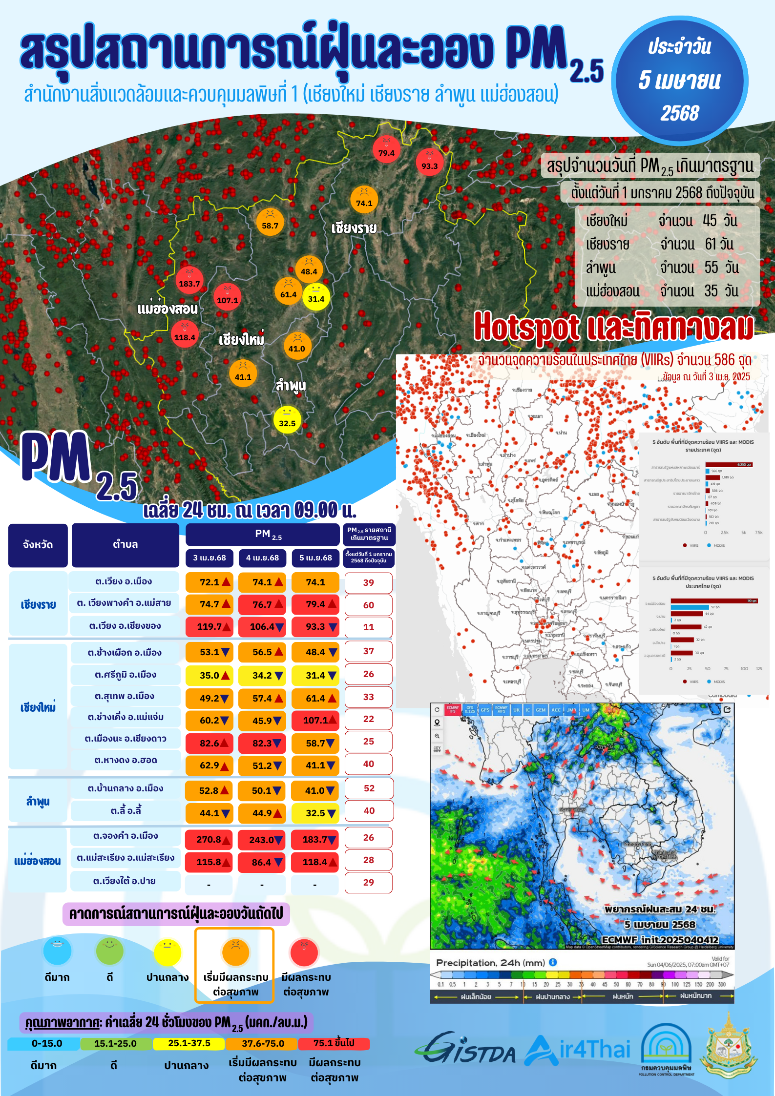 📢 สรุปสถานการณ์ฝุ่น PM2.5 ประจำวันที่ 5 เมษายน 2568 ในพื้นที่รับผิดชอบของสำนักงานสิ่งแวดล้อมและควบคุมมลพิษที่ 1 (เชียงใหม่ เชียงราย ลำพูน แม่ฮ่องสอน)