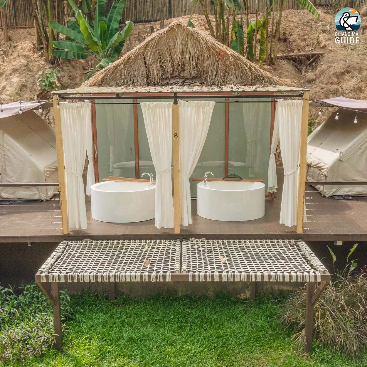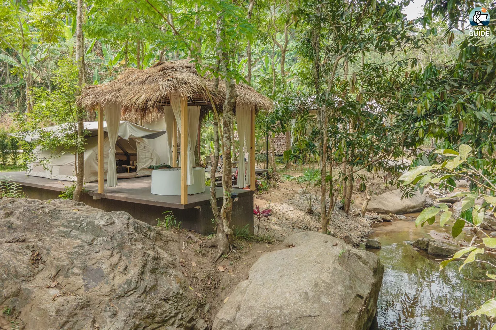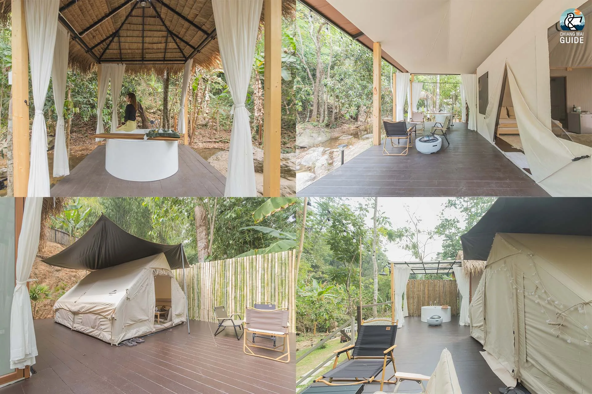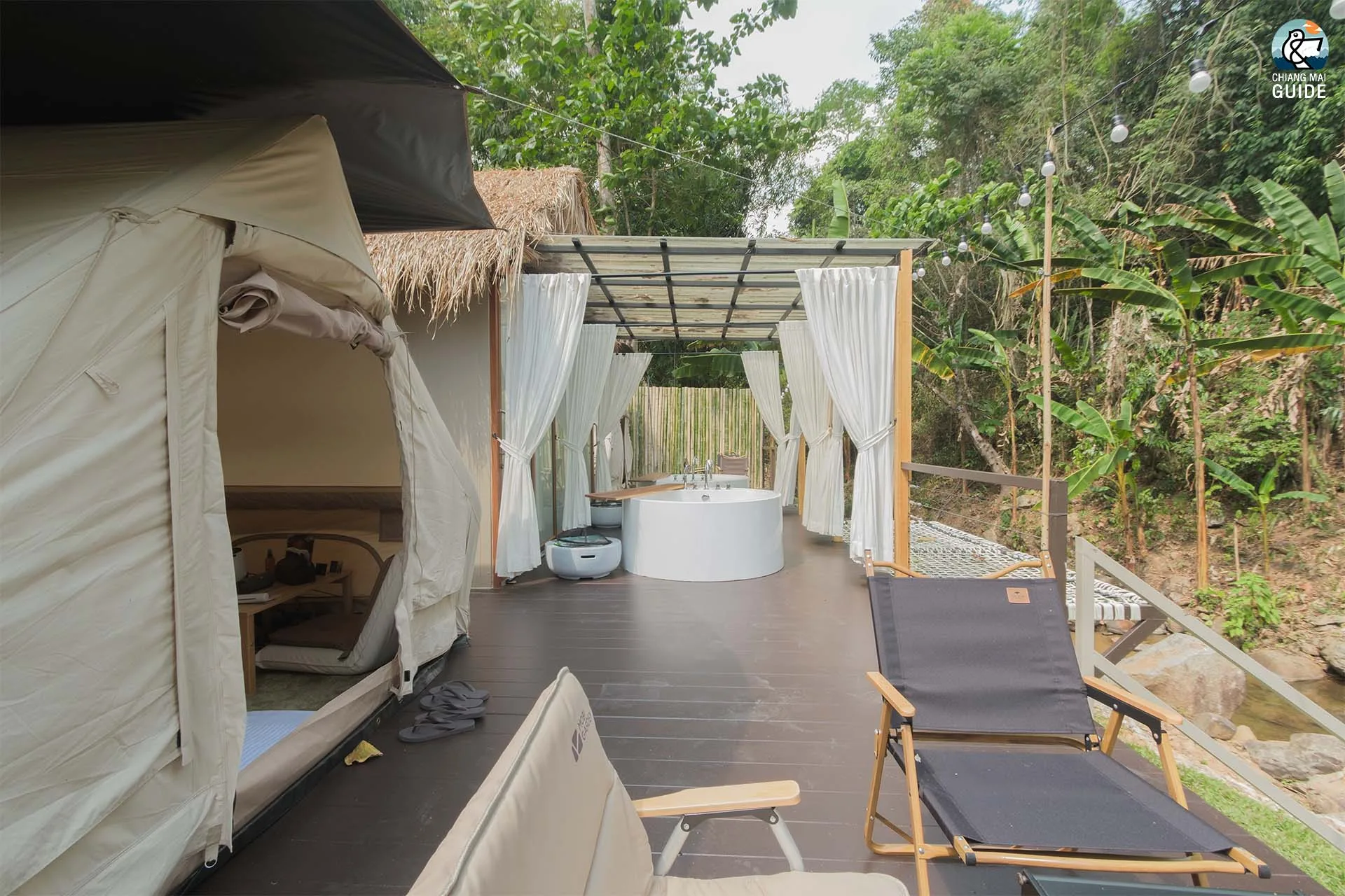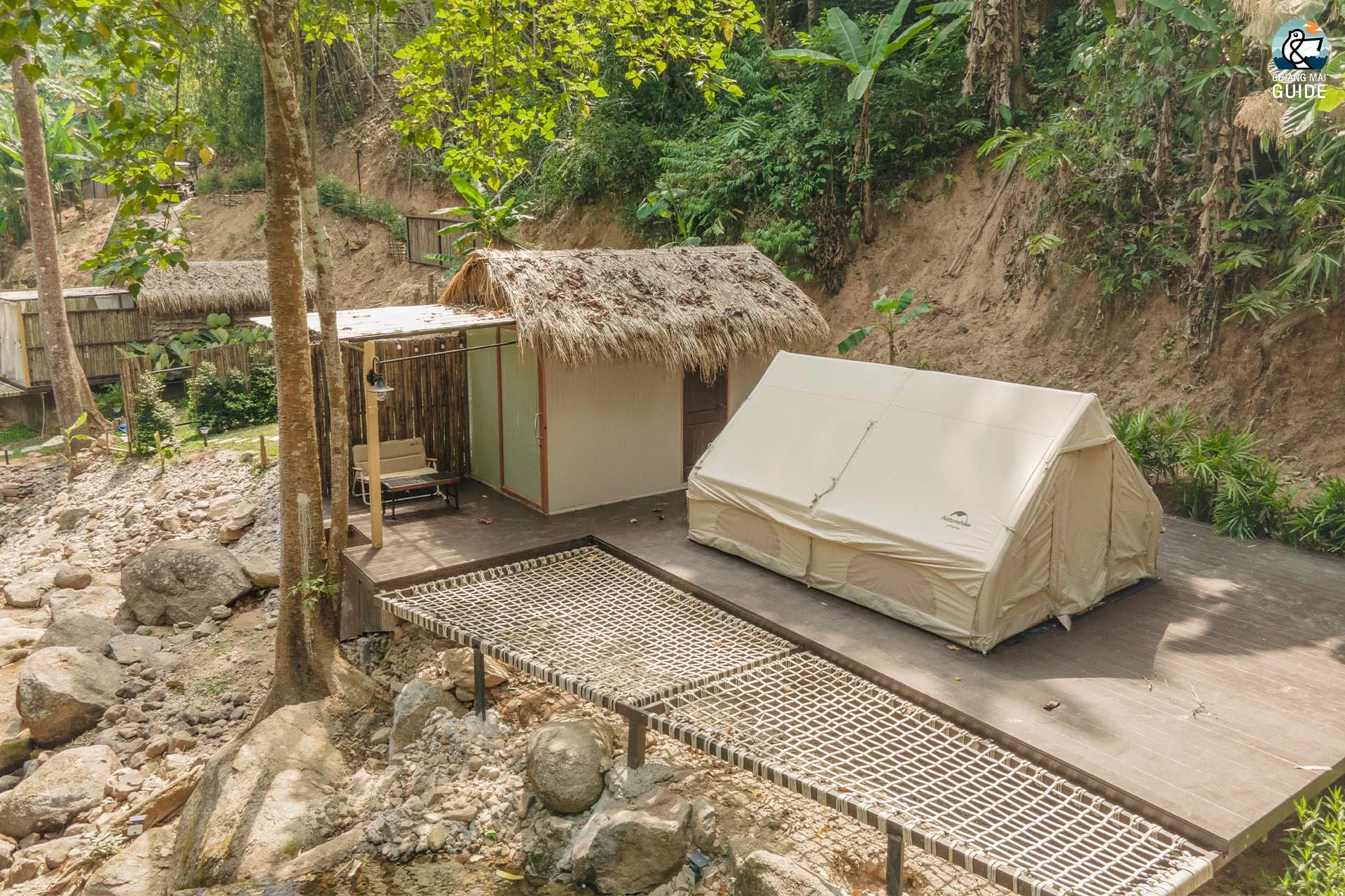 รีสอร์ทน้องใหม่ตั้งอยู่ริมแม่น้ำ มาพร้อมกับเต็นท์กระโจมสไตล์แคมป์ปิ้งที่ตกแต่งและอุปกรณ์ครบครัน เช่น ห้องน้ำส่วนตัว อ่างอาบน้ำ และเครื่องฉายโปรเจคเตอร์ในแต่ละเต็นท์