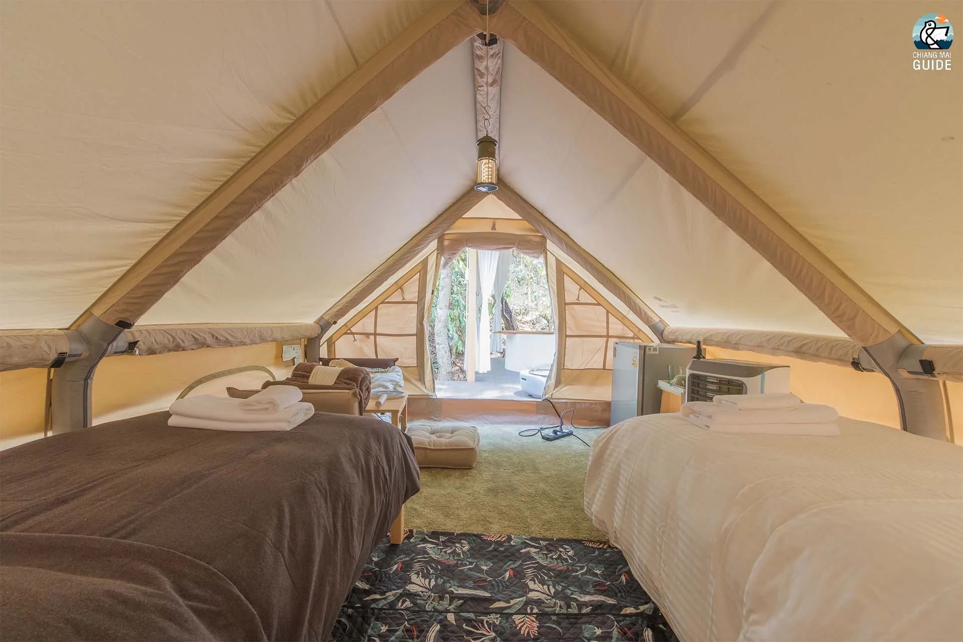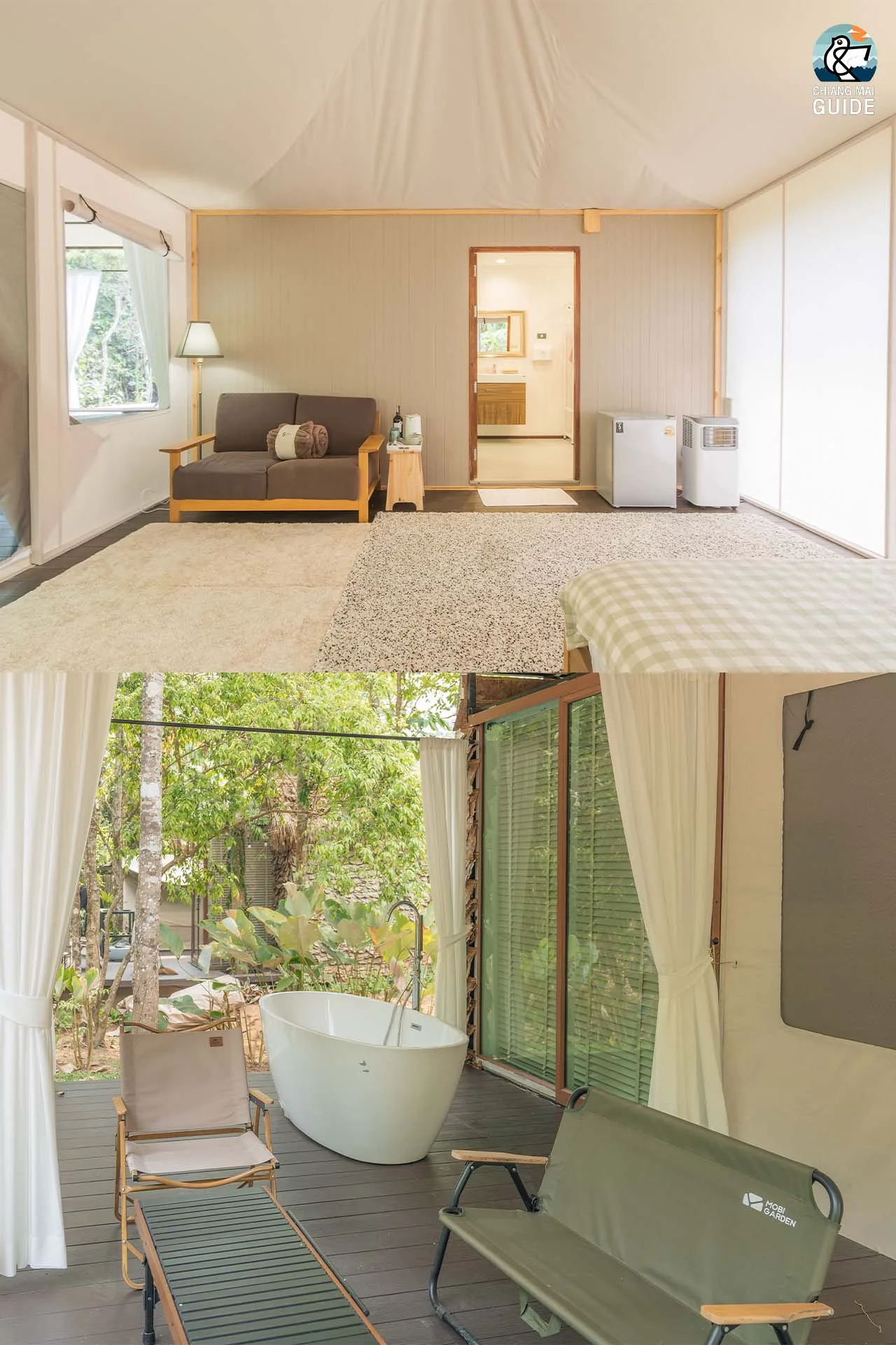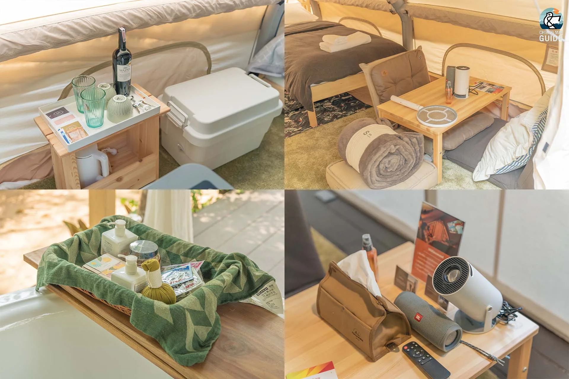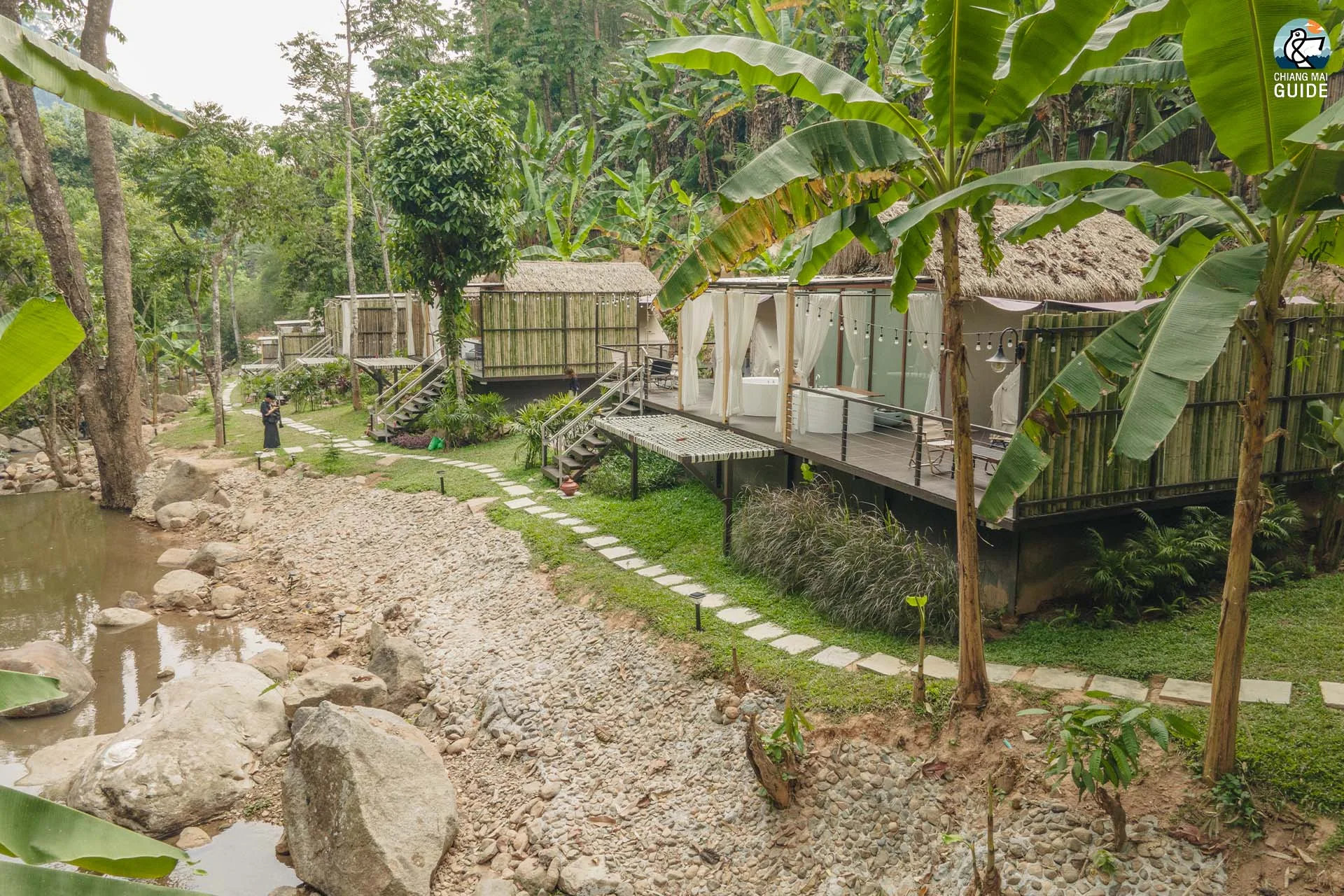 รีสอร์ทน้องใหม่ตั้งอยู่ริมแม่น้ำ มาพร้อมกับเต็นท์กระโจมสไตล์แคมป์ปิ้งที่ตกแต่งและอุปกรณ์ครบครัน เช่น ห้องน้ำส่วนตัว อ่างอาบน้ำ และเครื่องฉายโปรเจคเตอร์ในแต่ละเต็นท์