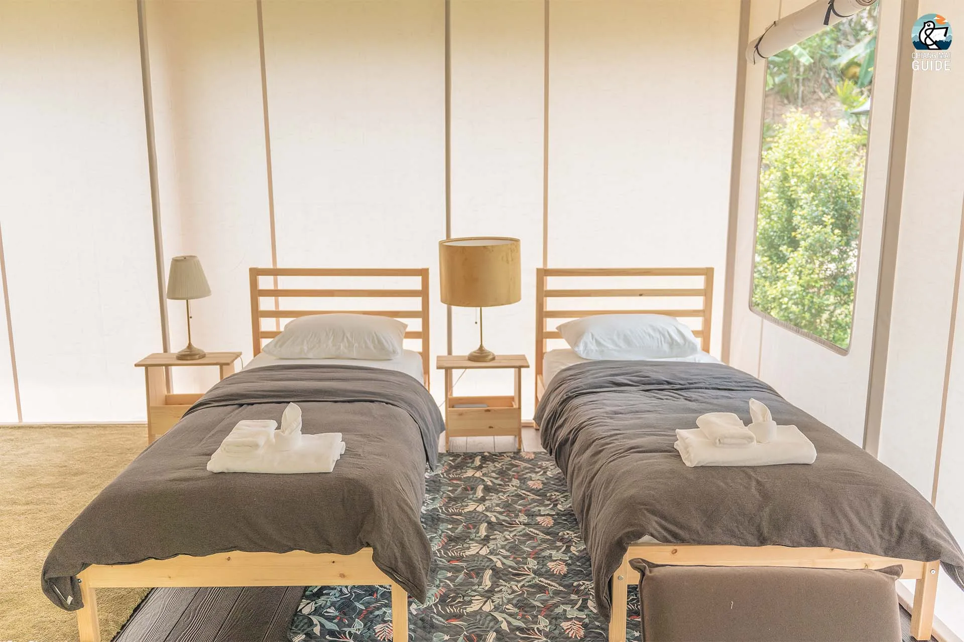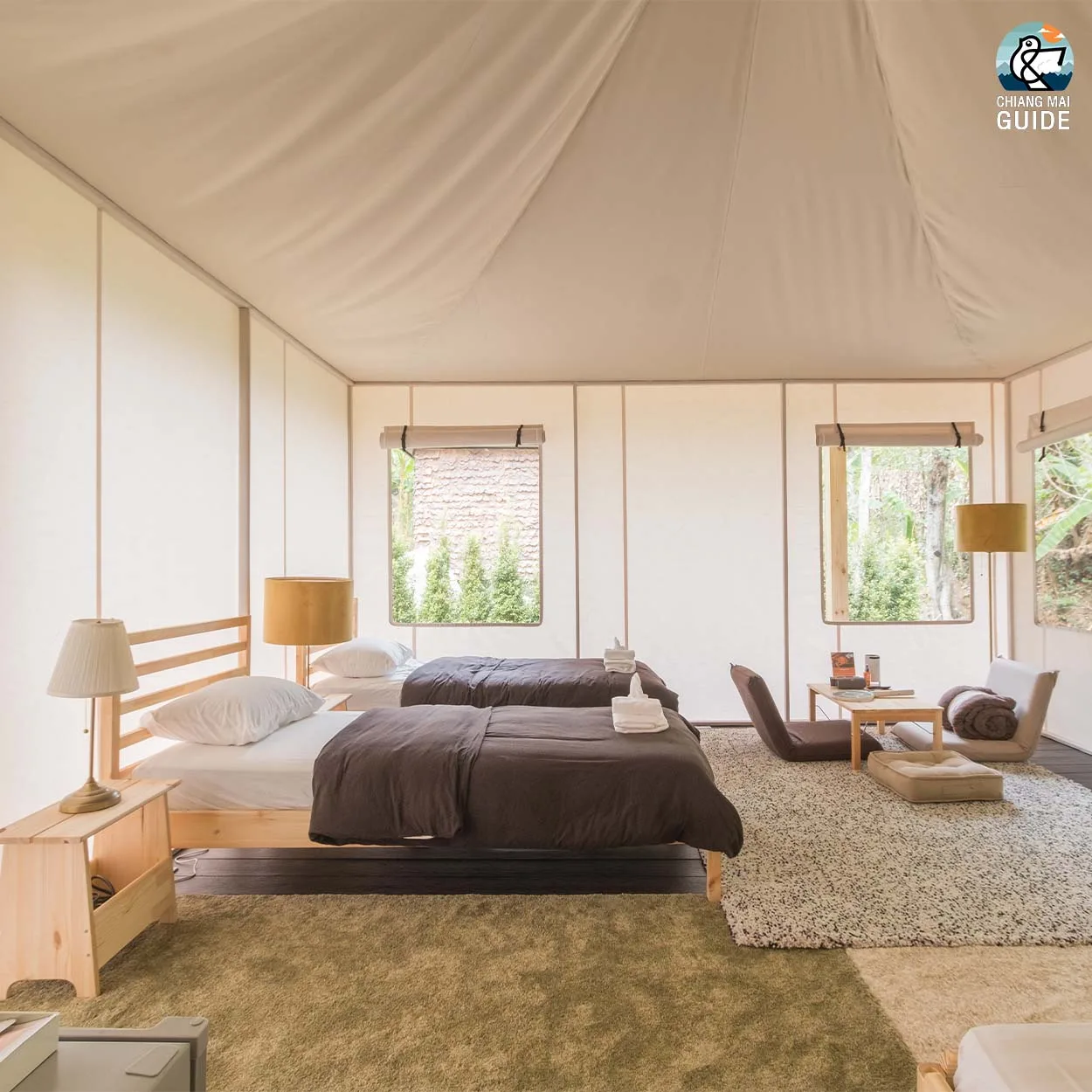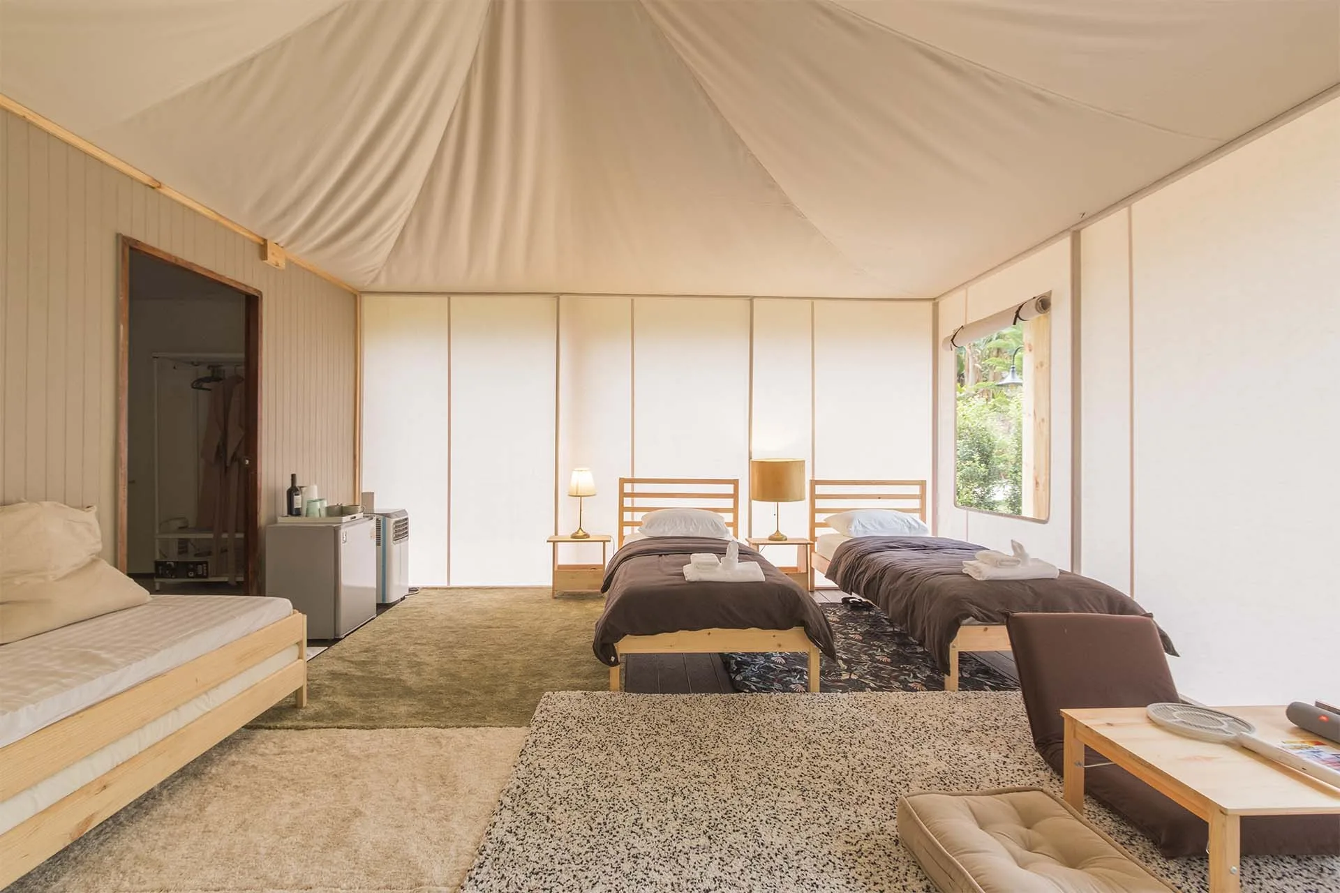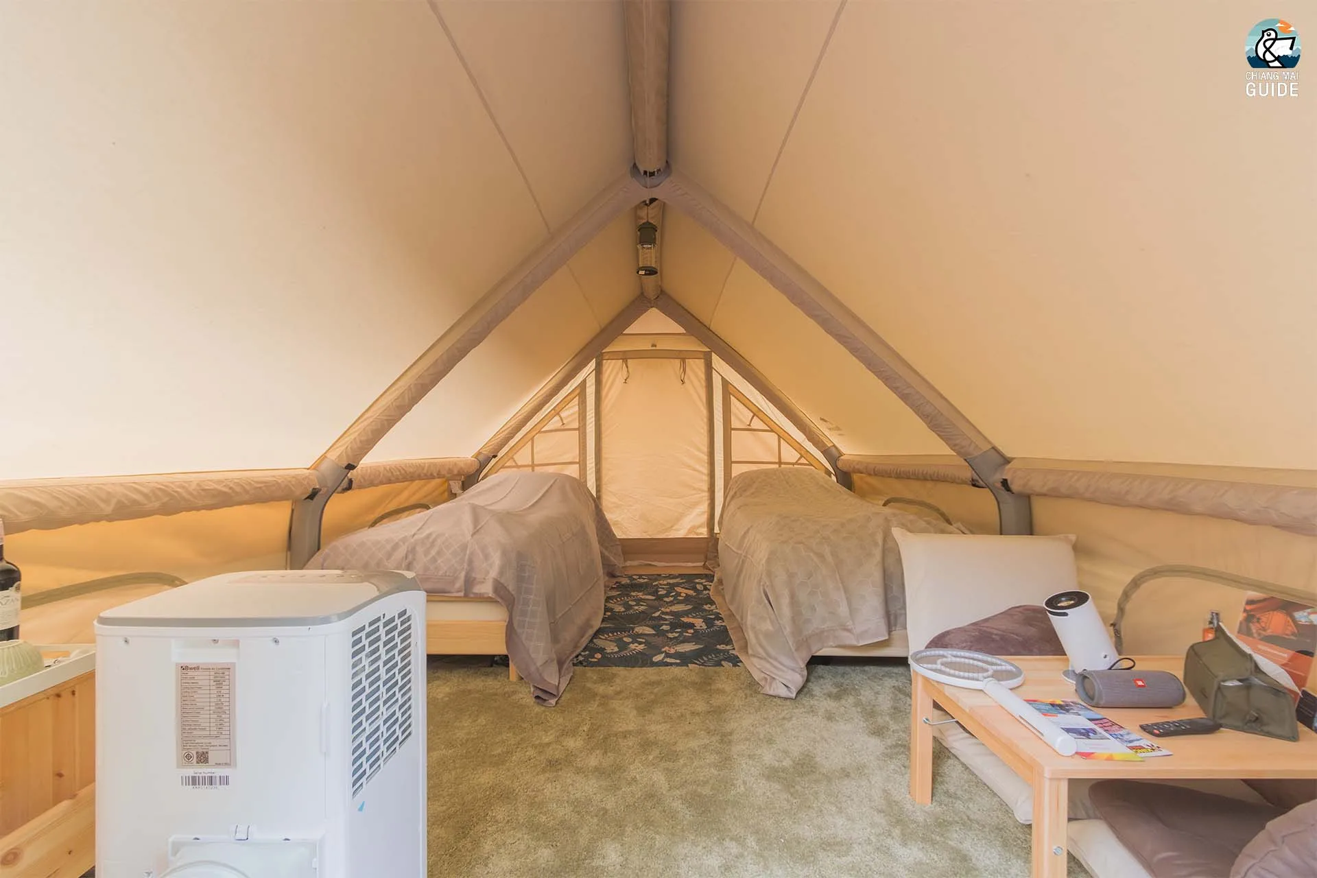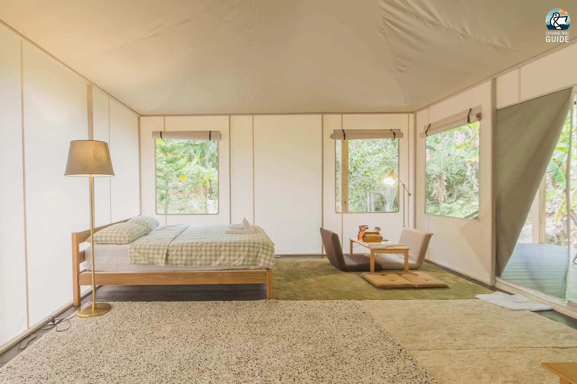 รีสอร์ทน้องใหม่ตั้งอยู่ริมแม่น้ำ มาพร้อมกับเต็นท์กระโจมสไตล์แคมป์ปิ้งที่ตกแต่งและอุปกรณ์ครบครัน เช่น ห้องน้ำส่วนตัว อ่างอาบน้ำ และเครื่องฉายโปรเจคเตอร์ในแต่ละเต็นท์
