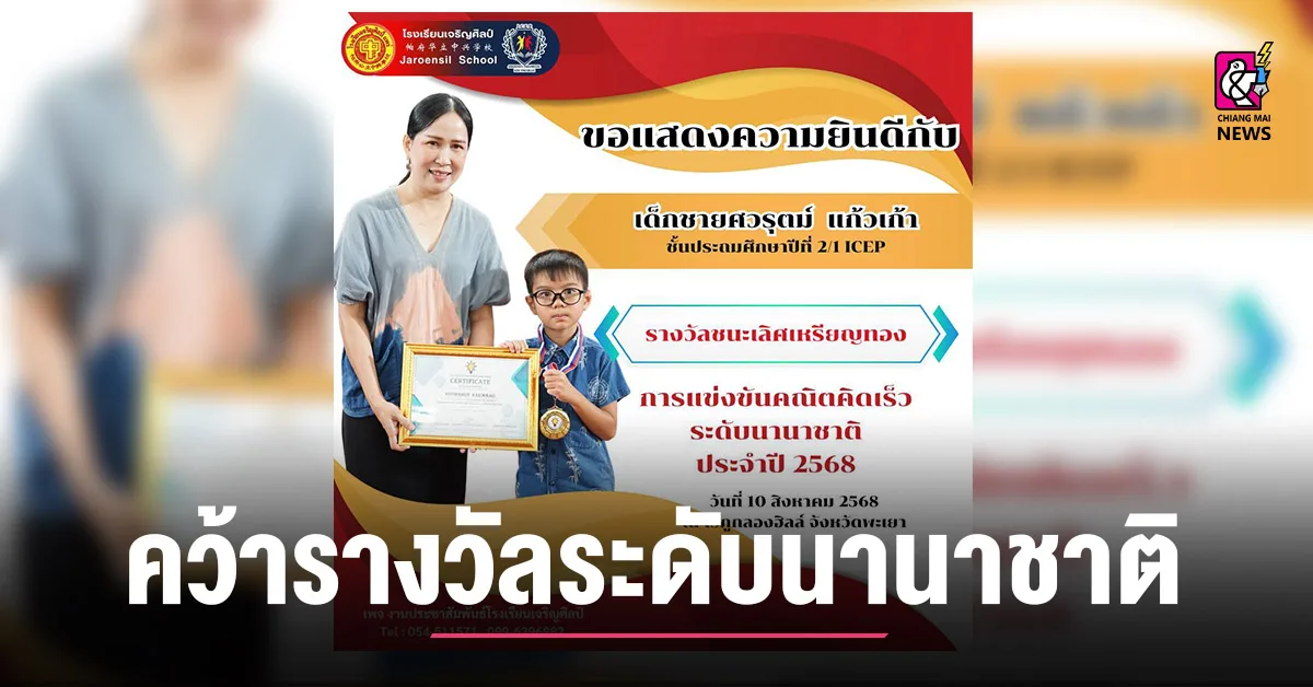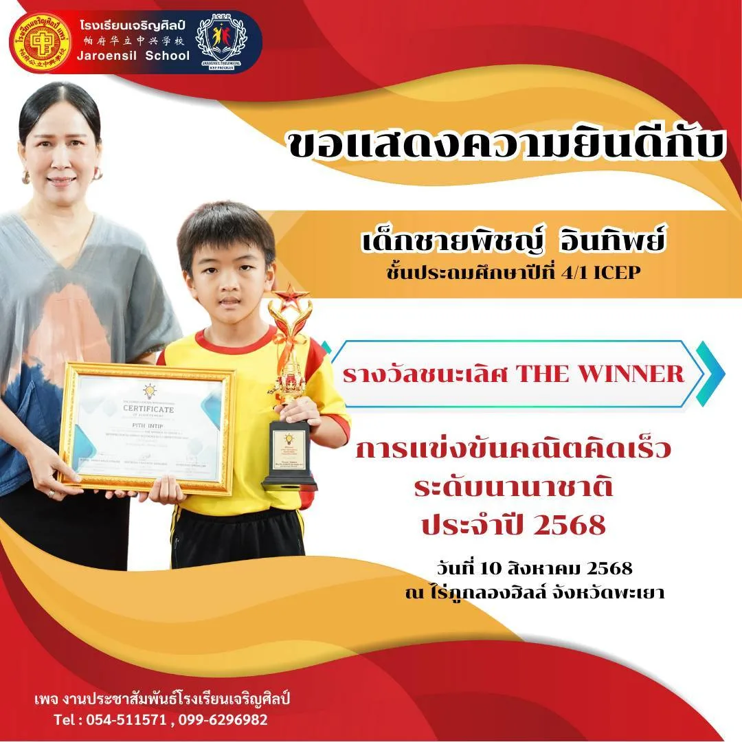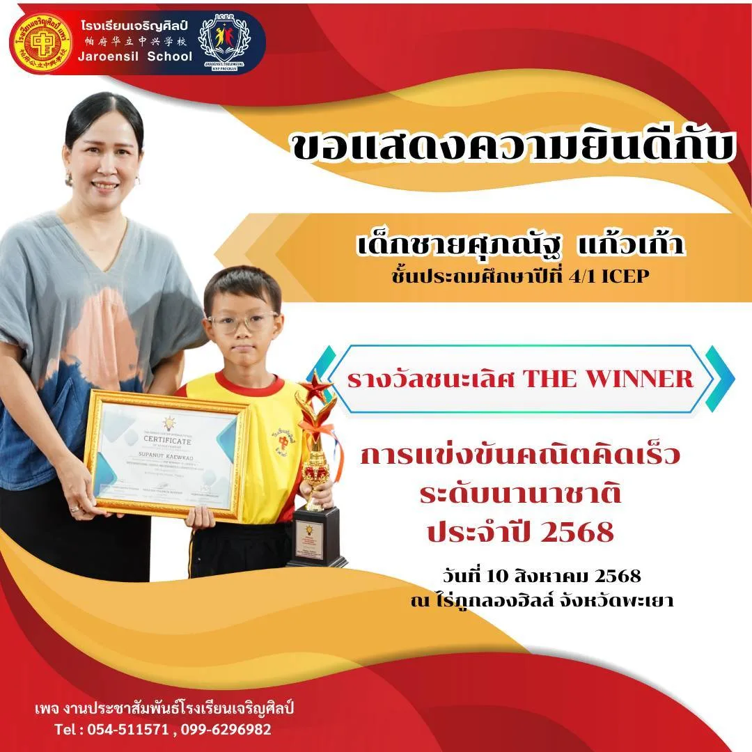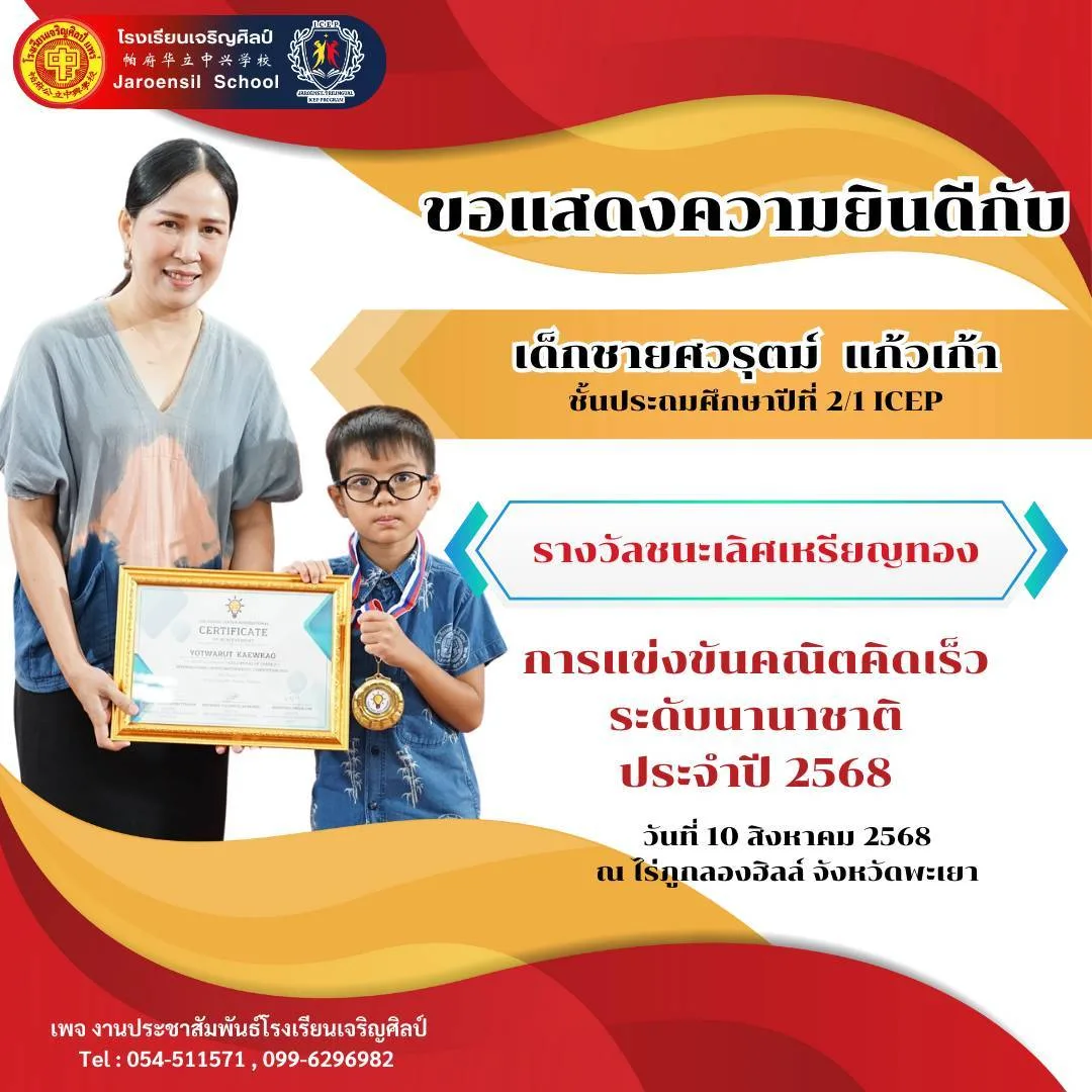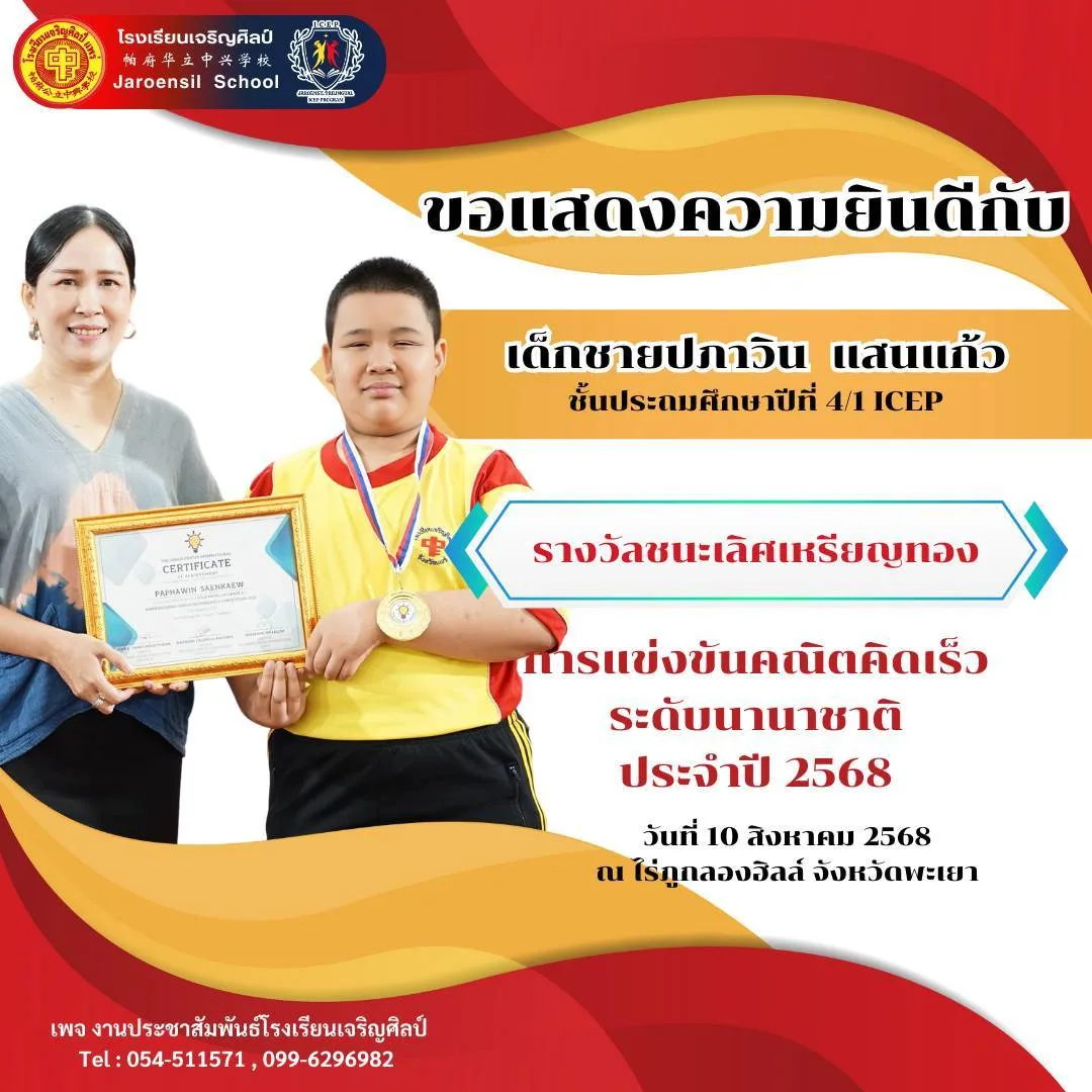 นายเอกชัย วงศ์วรกุล ประธานมูลนิธิเพื่อการศึกษาโรงเรียนเจริญศิลป์อ.เมือง จ.แพร่ขอแสดงความยินดีกับนักเรียนคนเก่งที่สร้างชื่อเสียงให้กับโรงเรียนและประเทศไทย จากการเข้าร่วม การแข่งขันคณิตคิดเร็วระดับนานาชาติ ประจำปี 2568 จัดขึ้นเมื่อวันที่ 10 สิงหาคม 2568 ณ ไร่ภูกลองฮิลล์ จังหวัดพะเยา