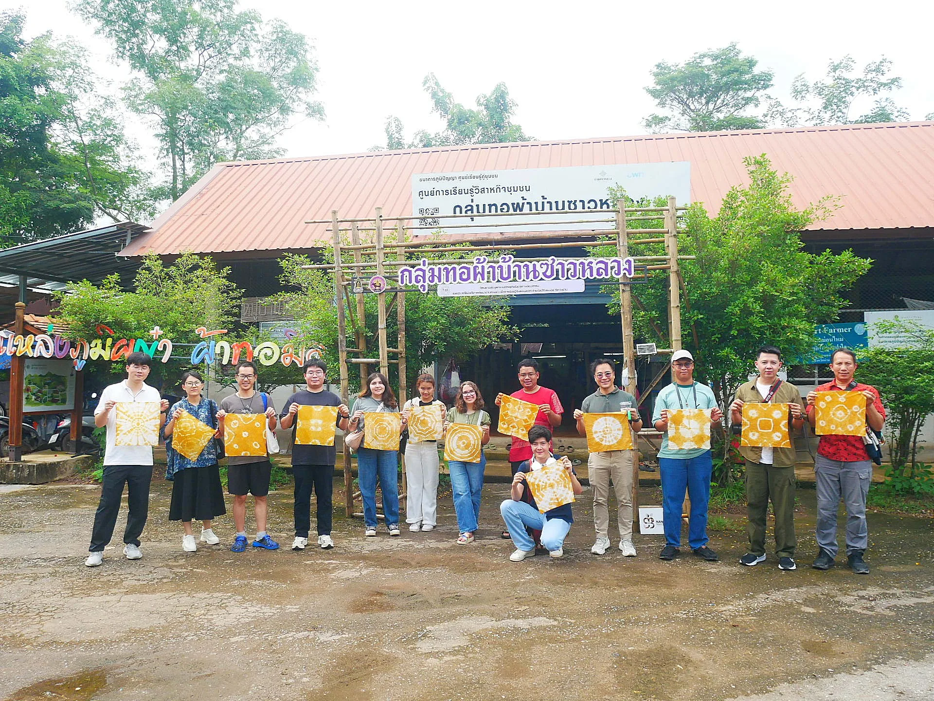 เดินทางสู่ บ้านซาวหลวง โดย นายกฏกก แปงใจ เรียนรู้ภูมิปัญญาการทอผ้าฝ้ายแบบดั้งเดิม พร้อมทั้งร่วมกิจกรรมเรียนรู้การมัดย้อมผ้าฝ้ายด้วยสีธรรมชาติ (ย้อมเย็น) เรียนรู้การย้อมผ้าสีเหลืองขมิ้น
