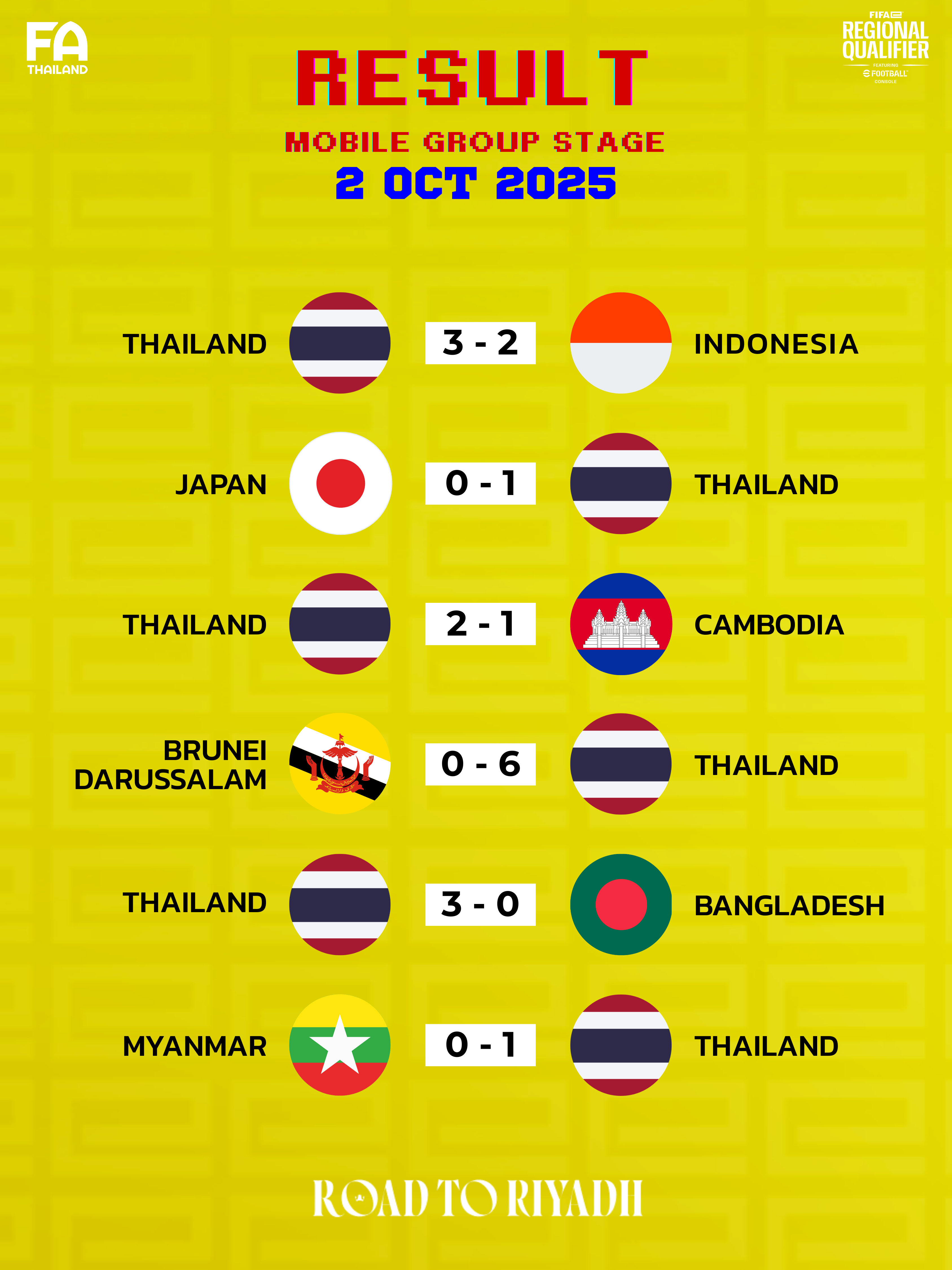 จากผลงานดังกล่าวทำให้ อีสปอร์ตทีมชาติไทย ประเภท Console ขึ้นนำเป็นอันดับ 1 ของกลุ่ม เอ จากการชนะ 6 นัดรวด พร้อมทำไป 16 ประตู และ เสีย 3 ประตู