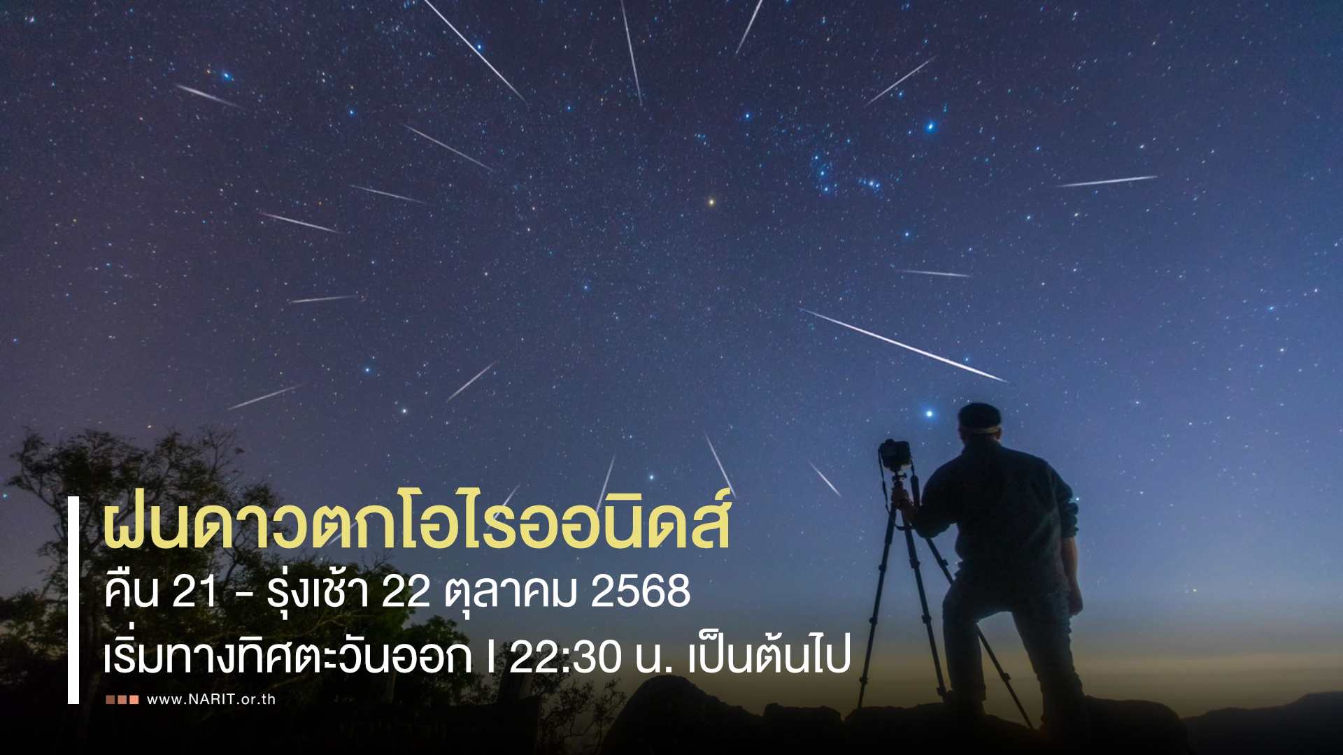 “ฝนดาวตกโอไรออนิดส์” หรือฝนดาวตกในกลุ่มดาวนายพราน เป็นฝนดาวตกที่เกิดขึ้นในช่วงวันที่ 2 ตุลาคม – 7 พฤศจิกายน ของทุกปี ในปี 2568 คาดว่ามีอัตราการตกสูงสุดเฉลี่ยประมาณ 20 ดวงต่อชั่วโมง ในคืนวันที่ 21 ต่อเนื่องถึงรุ่งเช้า 22 ตุลาคม 2568 เริ่มสังเกตการณ์ได้ตั้งแต่เวลาประมาณ 22.30 น. โดยจุดศูนย์กลางการกระจายตัวของฝนดาวตกจะอยู่บริเวณแขนของกลุ่มดาวนายพราน ปรากฏขึ้นทางทิศตะวันออก จากนั้นจะค่อย ๆ เคลื่อนสูงขึ้นสู่บริเวณกลางท้องฟ้า และสามารถเฝ้าชมได้ตลอดทั้งคืนจนถึงรุ่งเช้า