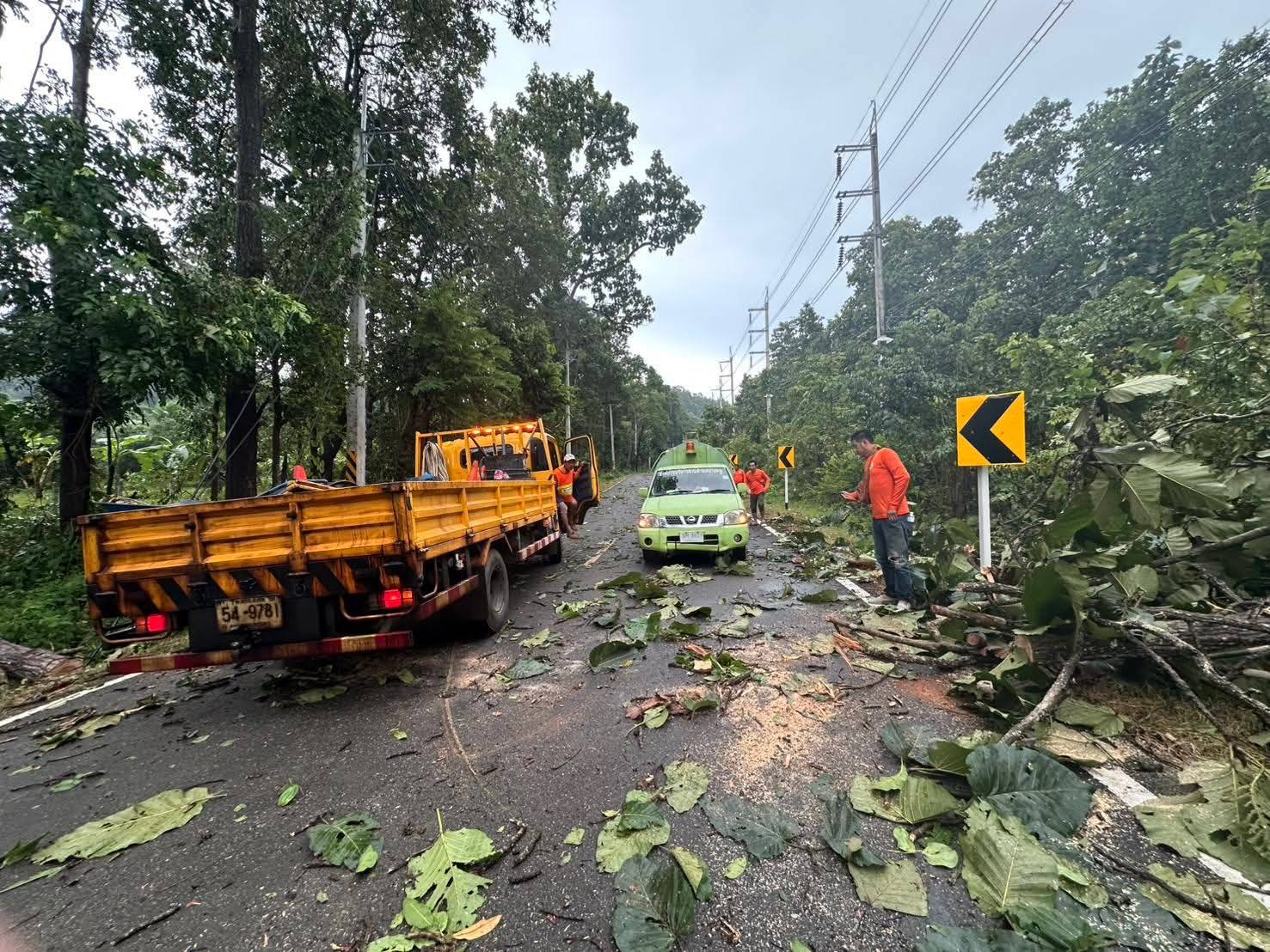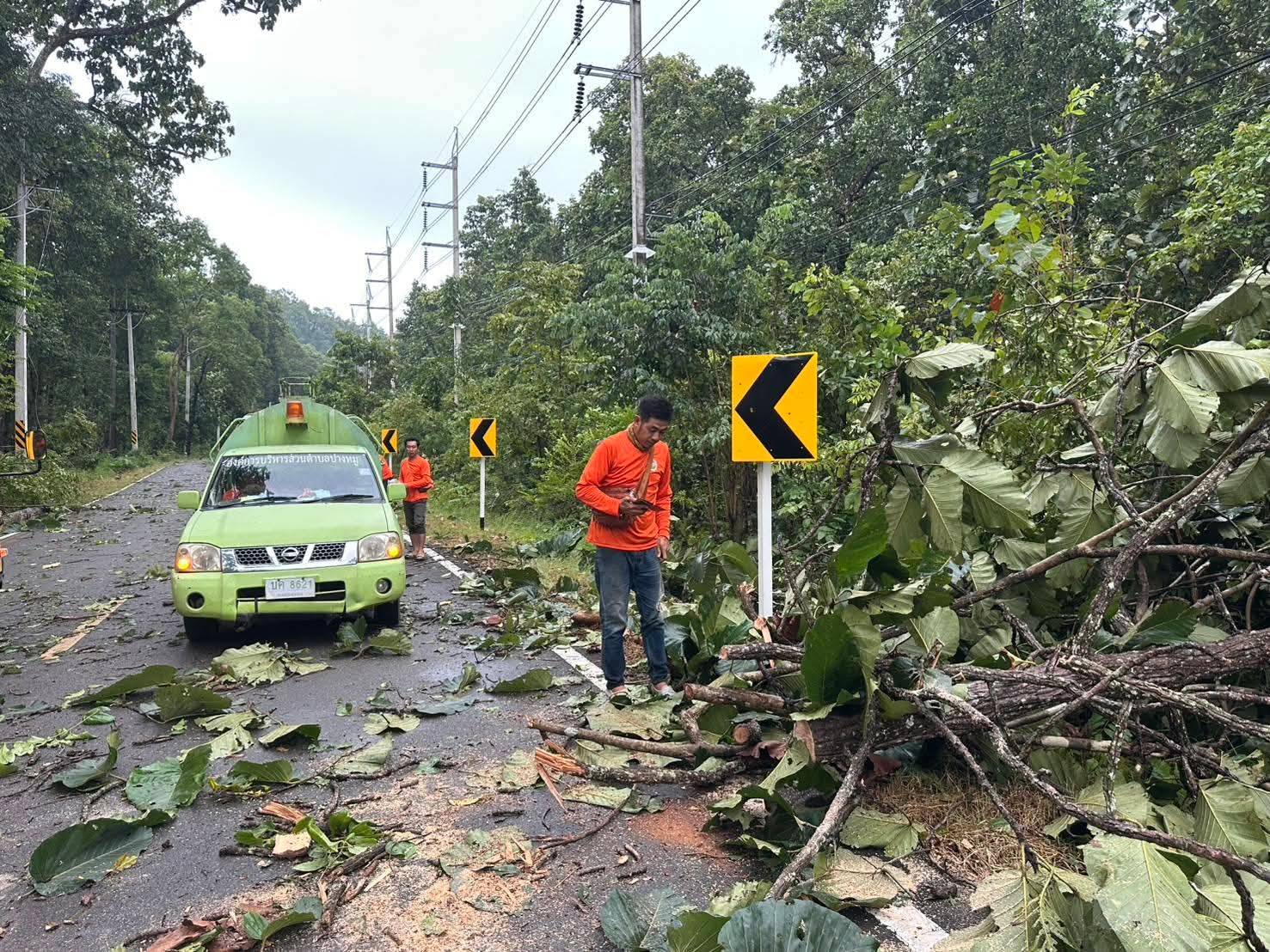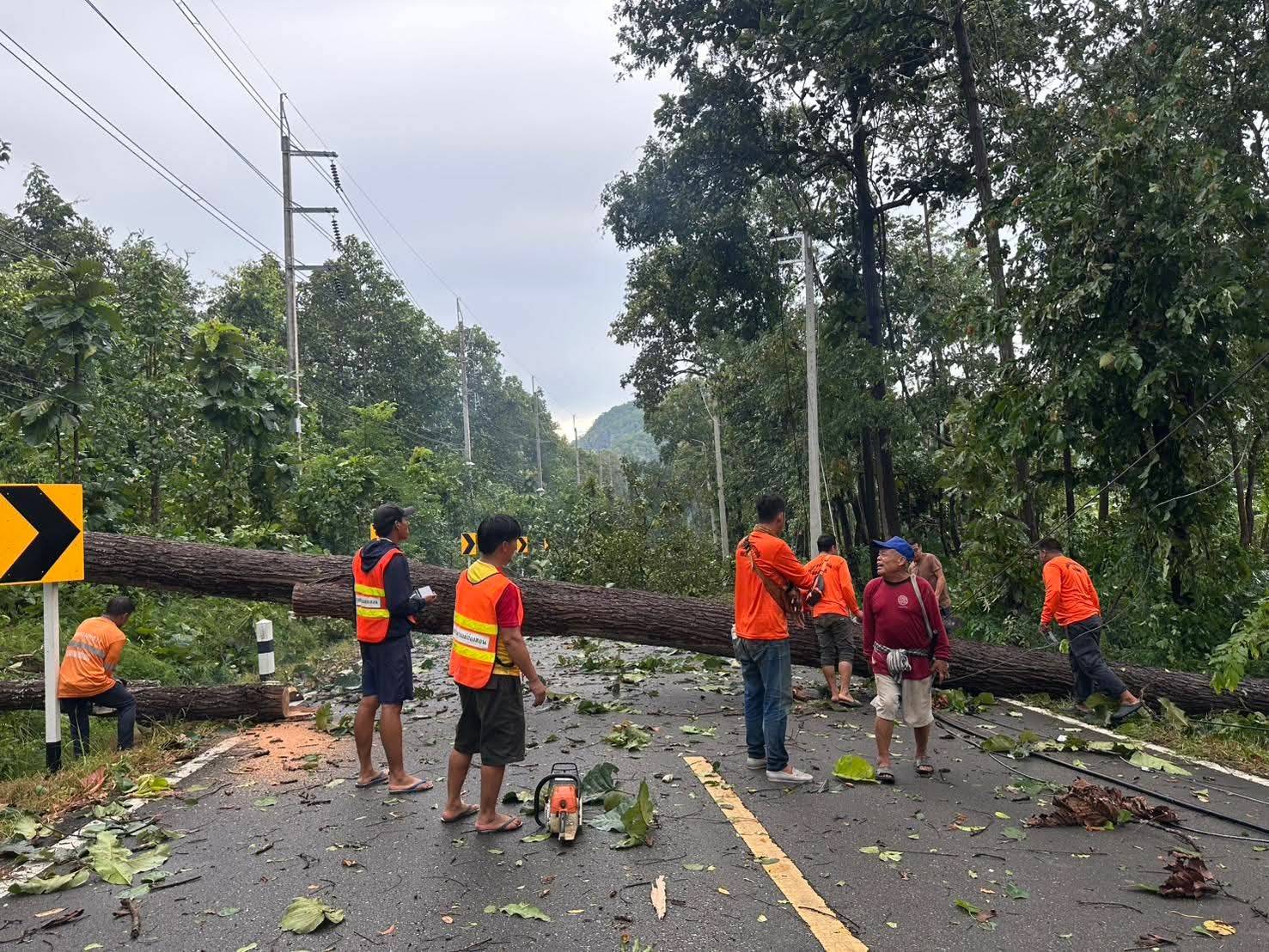 เปิดเส้นทางสัญจร หน้าสวนอิ่มใจ ต.ปางหมู ได้แล้ว หลังมีต้นไม้และเสาไฟฟ้าล้มขวางทางสัญจร ต้องใช้ความระมัดระวังในการขับขี่