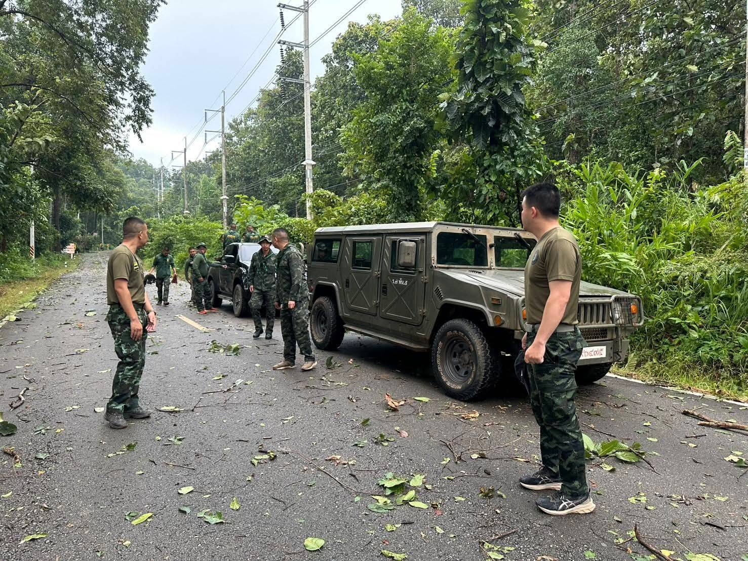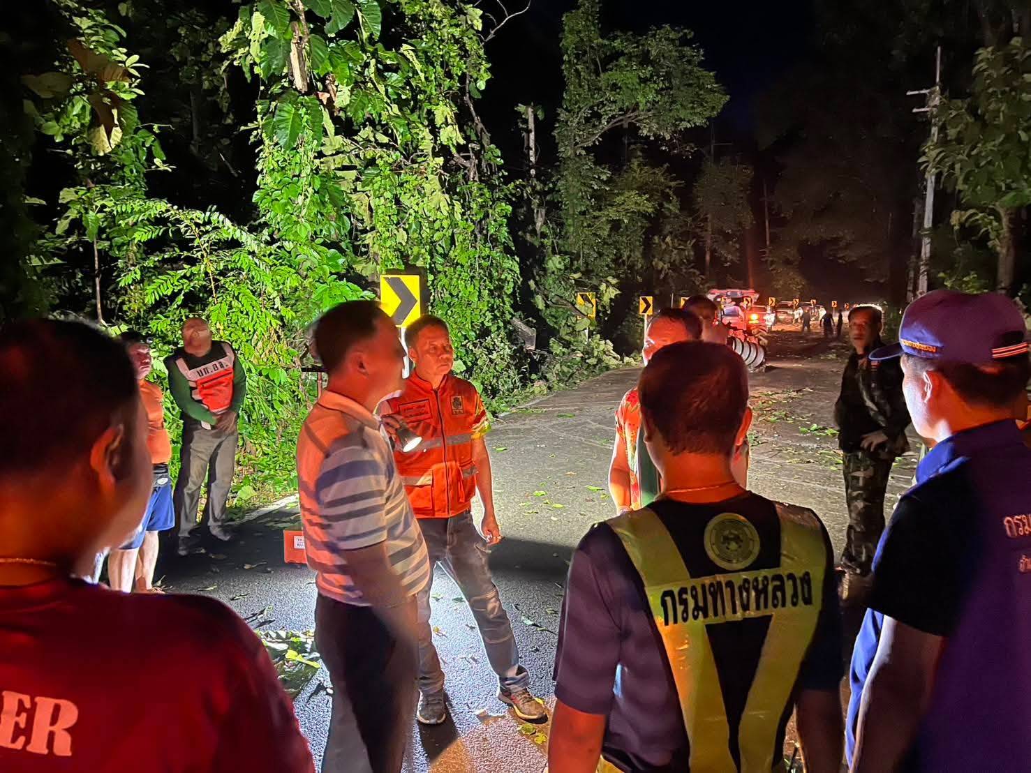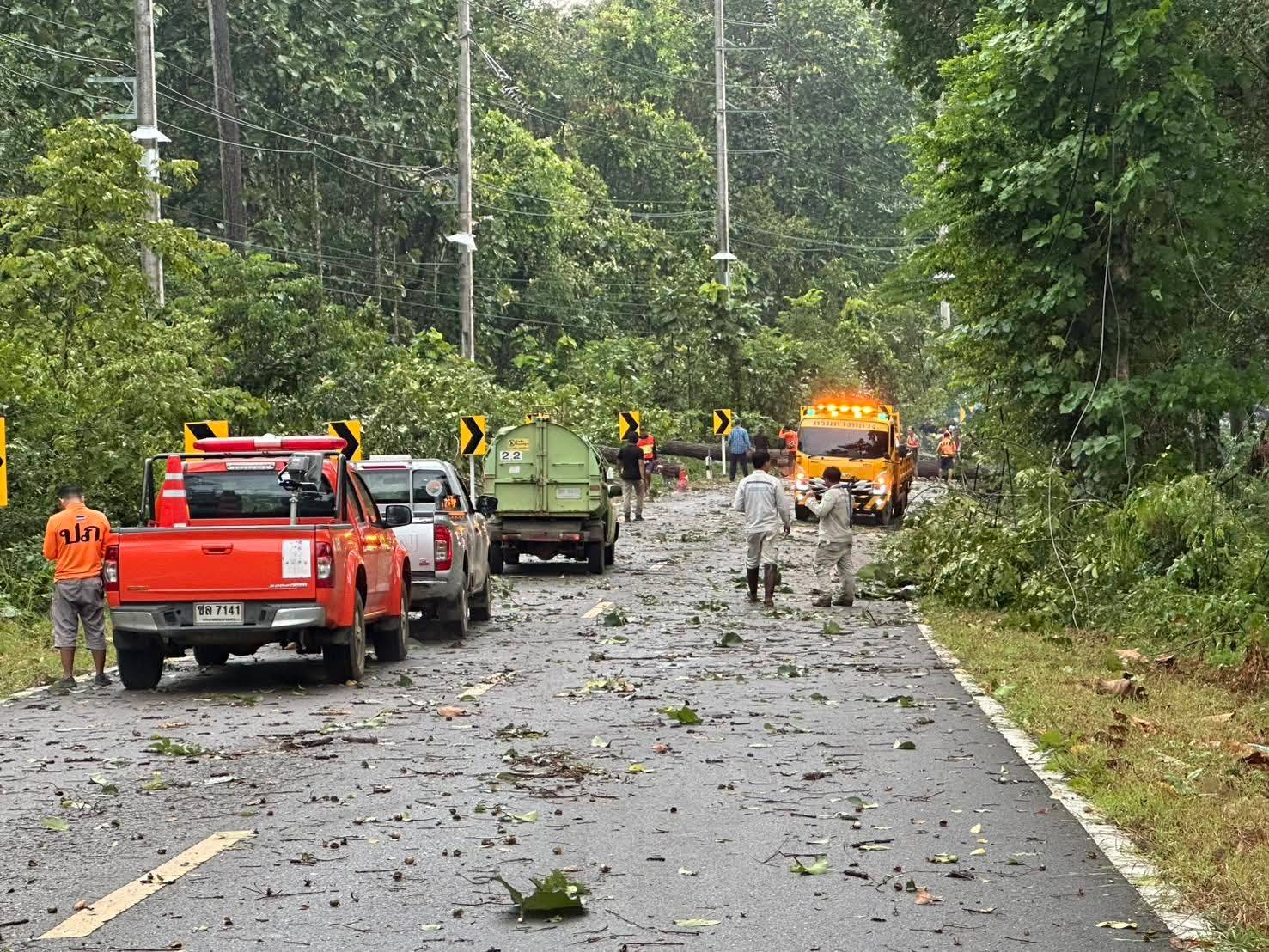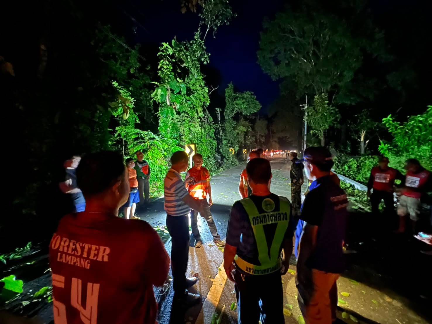 เปิดเส้นทางสัญจร หน้าสวนอิ่มใจ ต.ปางหมู ได้แล้ว หลังมีต้นไม้และเสาไฟฟ้าล้มขวางทางสัญจร ต้องใช้ความระมัดระวังในการขับขี่