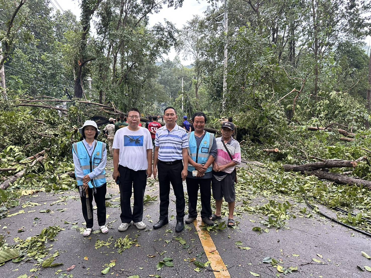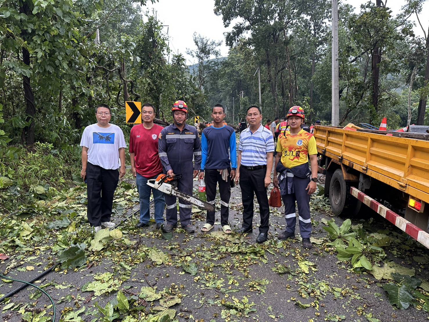 โดยก่อนหน้านี้ เมื่อเวลา 17.00 น. นายบุญลือ ธรรมธรานุรักษ์ รองผู้ว่าราชการจังหวัดแม่ฮ่องสอน ลงพื้นที่พร้อมด้วยหลายหน่วยงาน ประกอบด้วย สำนักงานป้องกันและบรรเทาสาธารณภัยจังหวัดแม่ฮ่องสอน หน่วยเฉพาะกิจสินหนาท โึรงการชลประทานแท่ฮ่องสอน และหน่วยงานที่เกี่ยวข้อง เร่งเปิดเส้นทางถนนสายหลักบริเวณหน้าสวนอิ่มใจ ตำบลปางหมู อำเภอเมือง จังหวัดแม่ฮ่องสอน ซึ่งมีต้นไม้และเสาไฟฟ้าล้มจำนวนหลายต้น ล้มขวางเส้นทางสัญจร ทำให้รถไม่สามารถสัญจรผ่านได้ จากเหตุฝนตกหนักช่วงบ่าย