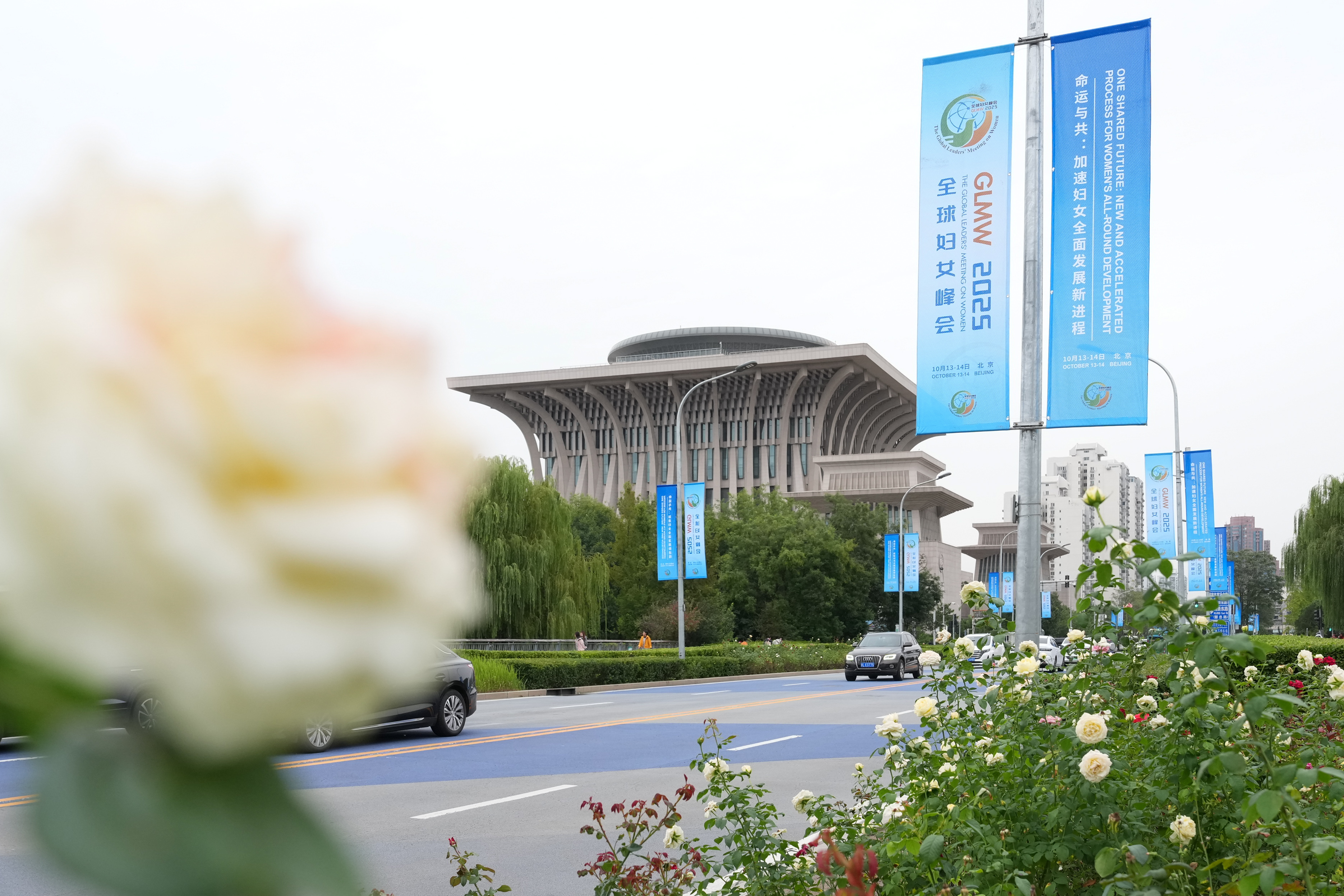 (แฟ้มภาพซินหัว : ป้ายประชาสัมพันธ์การประชุมผู้นำโลกว่าด้วยสตรีในกรุงปักกิ่งของจีน วันที่ 12 ต.ค. 2025)
