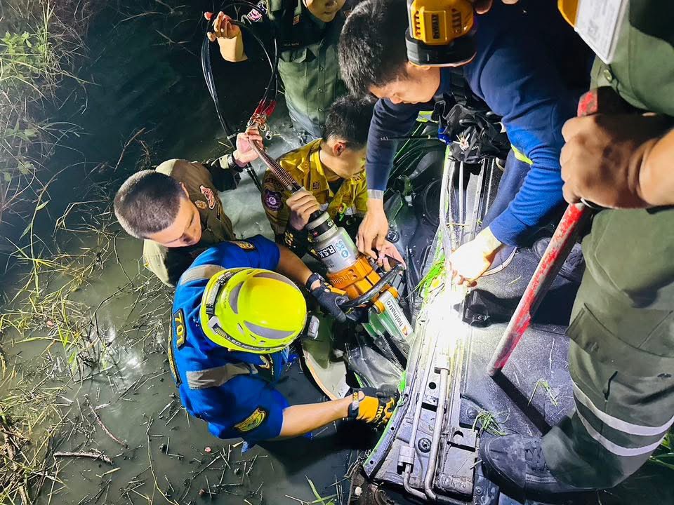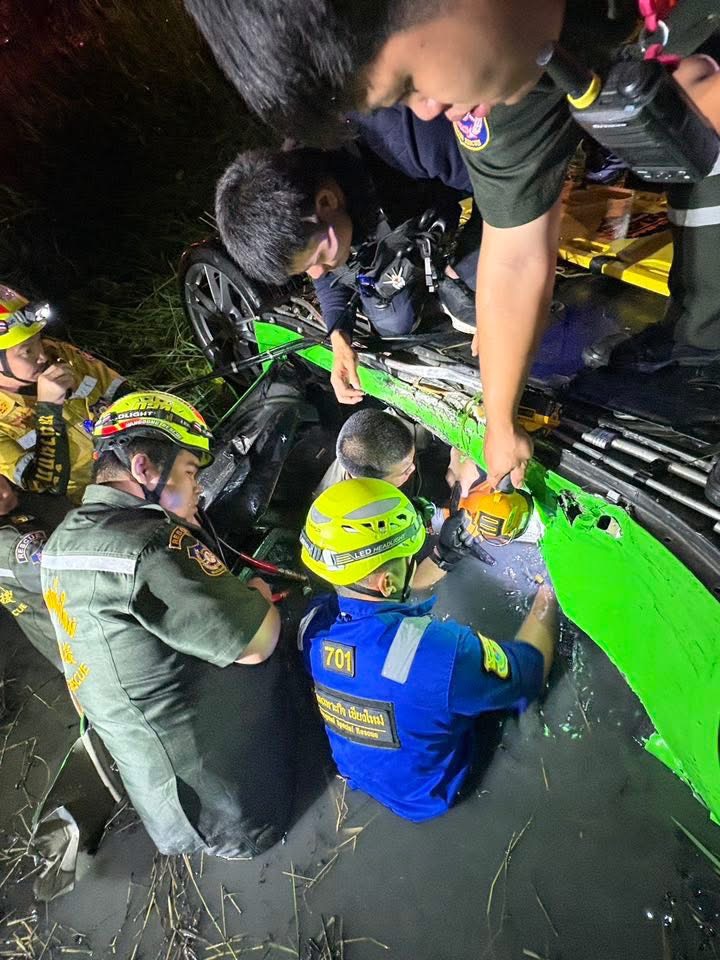 เมื่อเจ้าหน้าที่กู้ภัยเดินทางถึงที่เกิดเหตุ พบรถยนต์เก๋งสปอร์ต ยี่ห้อปอร์เช่ สีเขียว พลิกคว่ำหงายท้อง จมอยู่ในคูน้ำเกือบมิดคัน ภายในมีผู้ขับขี่ติดอยู่ไม่สามารถออกมาได้ ทีมกู้ภัยเฉพาะกิจจึงระดมกำลังร่วมกับ กู้ชีพ ทต.สันผักหวาน และกู้ชีพฯในพื้นที่ ใช้อุปกรณ์ ตัด-ถ่าง เฉพาะกิจเชียงใหม่ เปิดทางช่วยเหลือผู้ติดภายในรถ ท่ามกลางสถานการณ์ที่เต็มไปด้วยความตึงเครียด