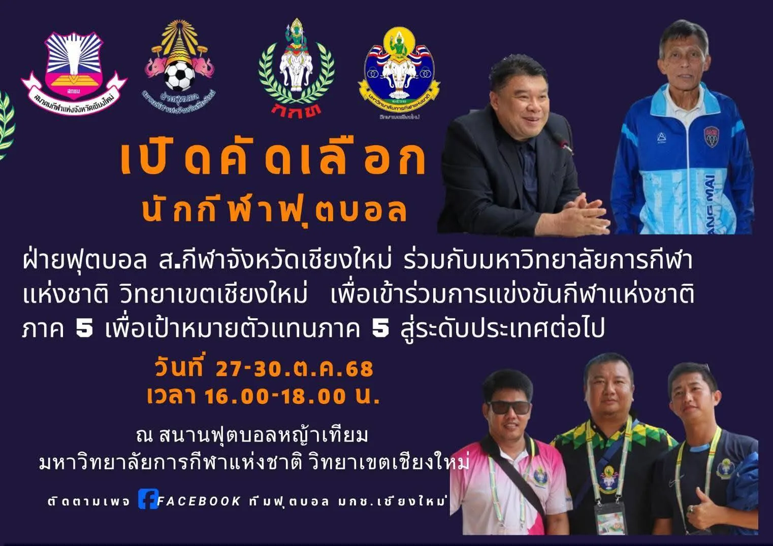 ฝ่ายฟุตบอลสมาคมกีฬาแห่งจังหวัดเชียงใหม่ ร่วมกับ มหาวิทยาลัยการกีฬาแห่งชาติ วิทยาเขตเชียงใหม่ เตรียมเปิดรับนักเตะที่มีภูมิลำเนาในเชียงใหม่ เพื่อเข้าร่วมในการแข่งขัน กีฬาแห่งชาติ ครั้งที่ 50 รอบคัดเลือกภาค 5 ที่ จังหวัดแพร่ ในปีหน้า