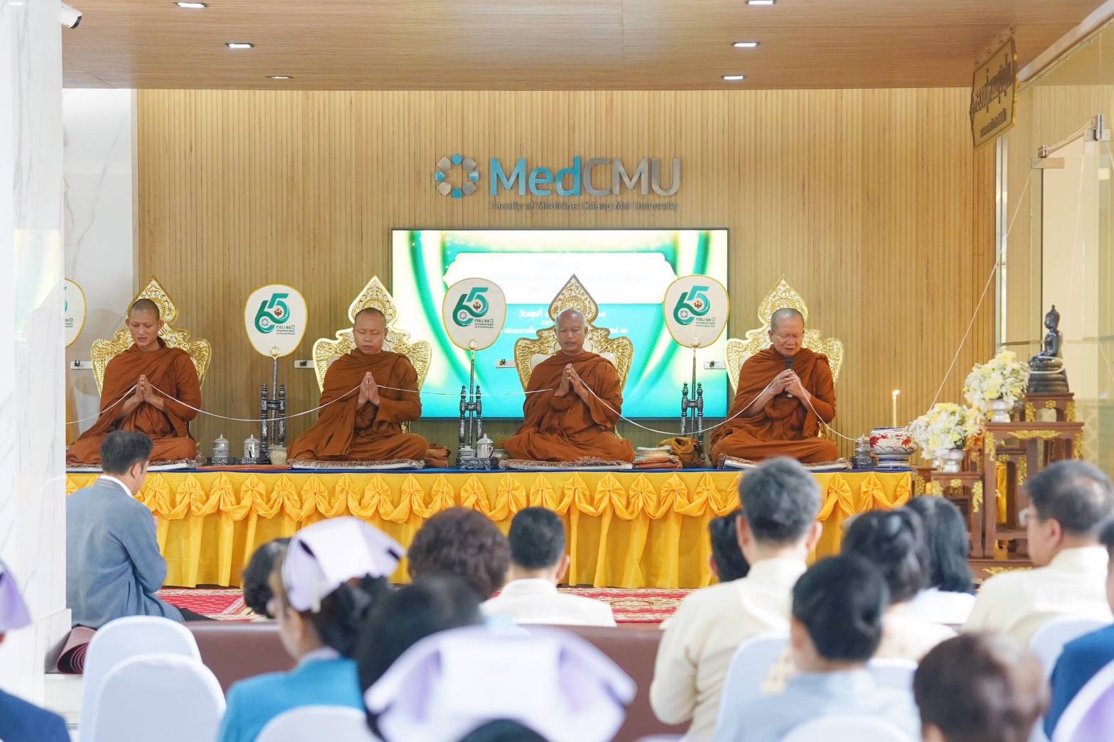 โดยมี รศ.พญ.อรินทยา พรหมินธิกุล ผู้อำนวยการโรงพยาบาลมหาราชนครเชียงใหม่ พร้อมด้วย ศ.(เชี่ยวชาญพิเศษ) นพ.บรรณกิจ โลจนาภิวัฒน์ ที่ปรึกษาผู้ทรงคุณวุฒิ, รศ.พญ.ยุพา สุมิตสวรรค์ ที่ปรึกษาผู้ทรงคุณวุฒิ, ศ.(เชี่ยวชาญพิเศษ) ดร.นิวัตน์ มณีกาญจน์ อาจารย์อาวุโสประจำภาควิชาจุลชีววิทยา, คณะผู้บริหาร แพทย์ พยาบาล ข้าราชการ บุคลากรคณะแพทยศาสตร์ มช. และประชาชนทั่วไป เข้าร่วมพิธีทำบุญเพื่อความเป็นสิริมงคล และอุทิศส่วนกุศลแด่ผู้เสียชีวิตในโรงพยาบาลมหาราชนครเชียงใหม่ จำนวน 1,167 ราย (ตั้งแต่วันที่ 28 ตุลาคม 2567 ถึง วันที่ 14 ตุลาคม 2568)