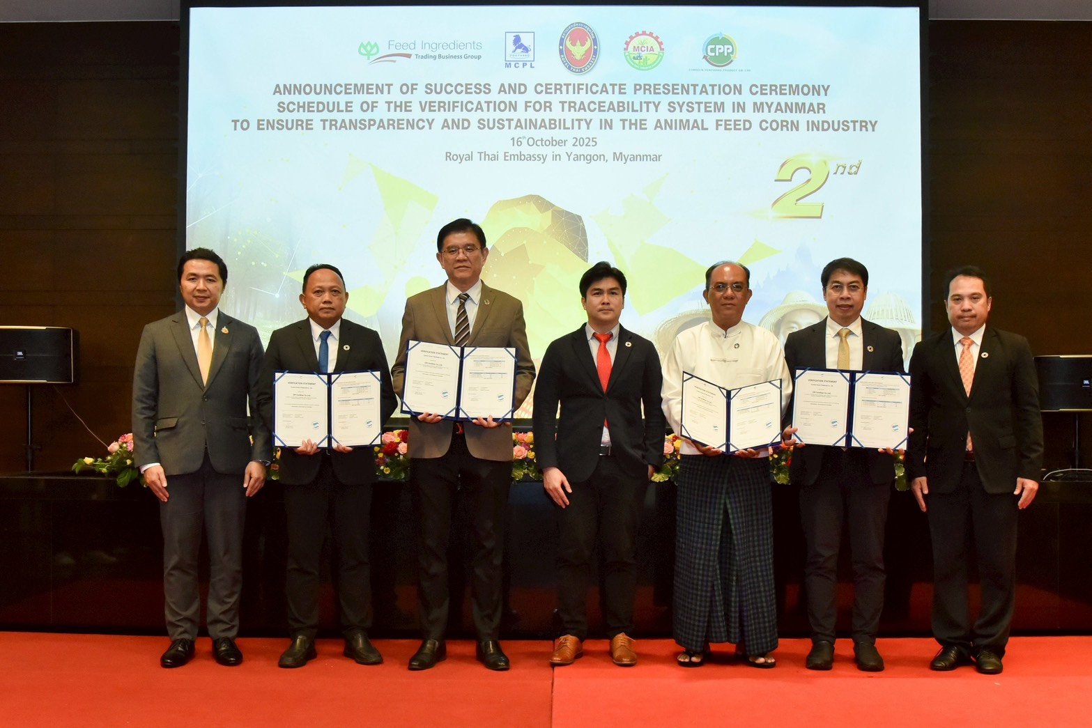 ย่างกุ้ง, เมียนมา | 16 ตุลาคม 2568 – สถานเอกอัครราชทูตไทย ณ กรุงย่างกุ้ง ร่วมกับเครือเจริญโภคภัณฑ์ (CP Group) สมาคมผู้ประกอบการข้าวโพดเลี้ยงสัตว์เมียนมา (MCIA) และ Control Union จากเนเธอร์แลนด์ จัดพิธีรับรองความสำเร็จครบรอบ 1 ปีของ “ระบบตรวจสอบย้อนกลับข้าวโพดเลี้ยงสัตว์ในเมียนมา” (Myanmar Corn Traceability System) ซึ่งเป็นกลไกสำคัญในการแก้ปัญหาหมอกควันข้ามพรมแดนและผลักดันการค้าเกษตรกรรมอย่างยั่งยืน ก่อนที่ประเทศไทยจะเริ่มใช้ มาตรการข้าวโพดปลอดการเผา อย่างเป็นทางการในวันที่ 1 มกราคม 2569 พิธีดังกล่าวจัดขึ้น ณ สถานเอกอัครราชทูตไทย กรุงย่างกุ้ง โดยมีหน่วยงานสำคัญจากทั้งสองประเทศเข้าร่วมอย่างคับคั่ง ทั้งจากกระทรวงพาณิชย์ สำนักงาน GISTDA ของไทย สมาคม MCIA ของเมียนมา และภาคเอกชนผู้ประกอบการหลักในห่วงโซ่อุปทาน ได้แก่ CPP Fertilizer, Bangkok Produce Merchandising (BKP) และ Myanmar C.P. Livestock ซึ่งทั้ง 4 รายนี้ได้รับมอบ Traceability Recommendation Letter จาก Control Union เพื่อรับรองผลการดำเนินงานในระบบตรวจสอบย้อนกลับตลอดห่วงโซ่คุณค่าอย่างเป็นทางการ