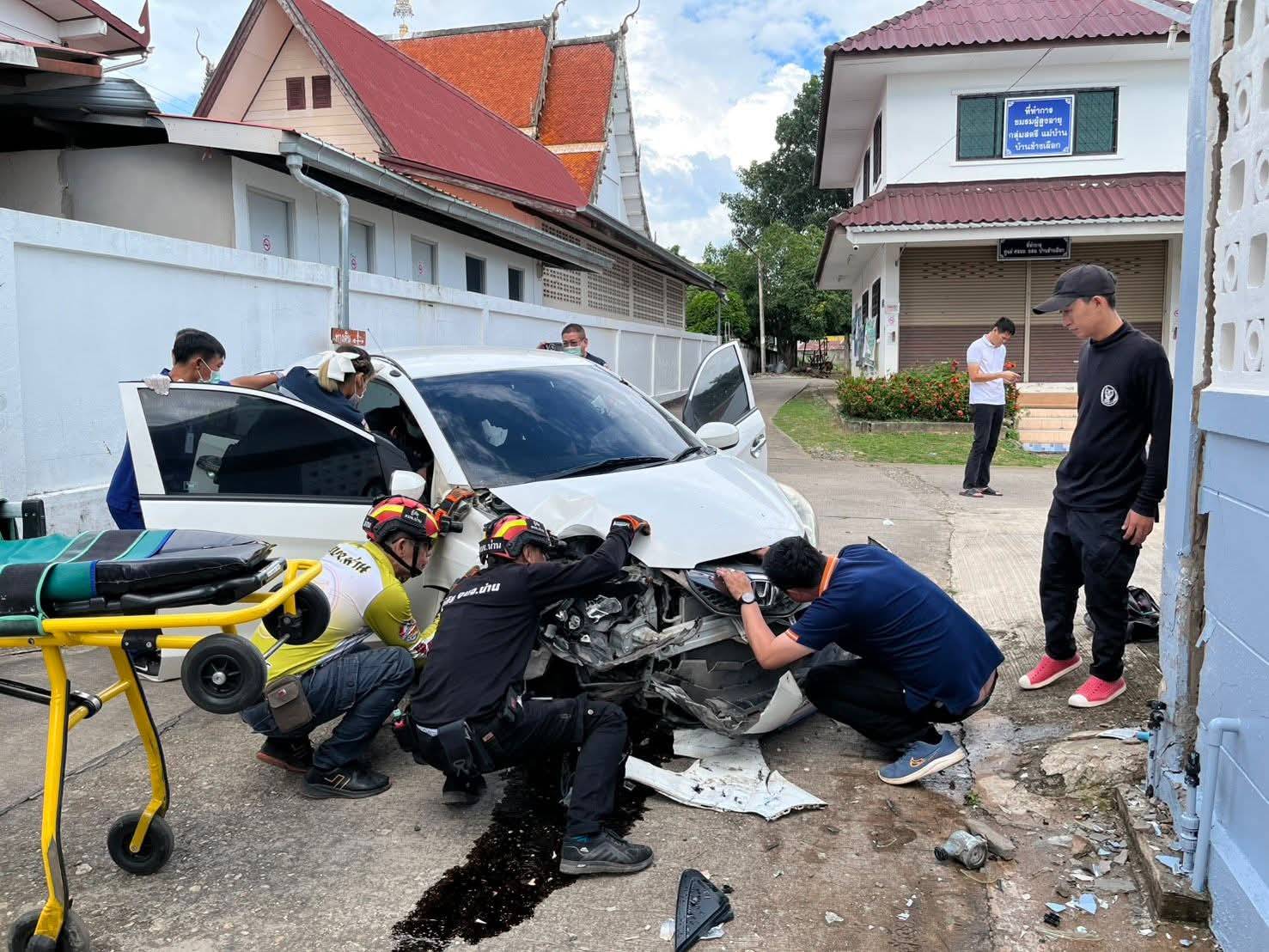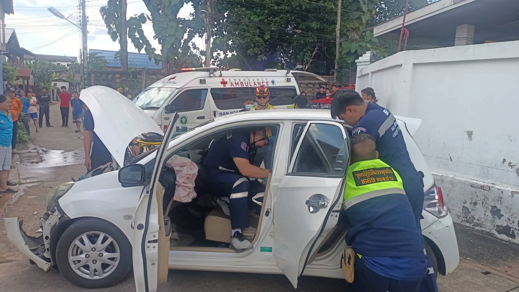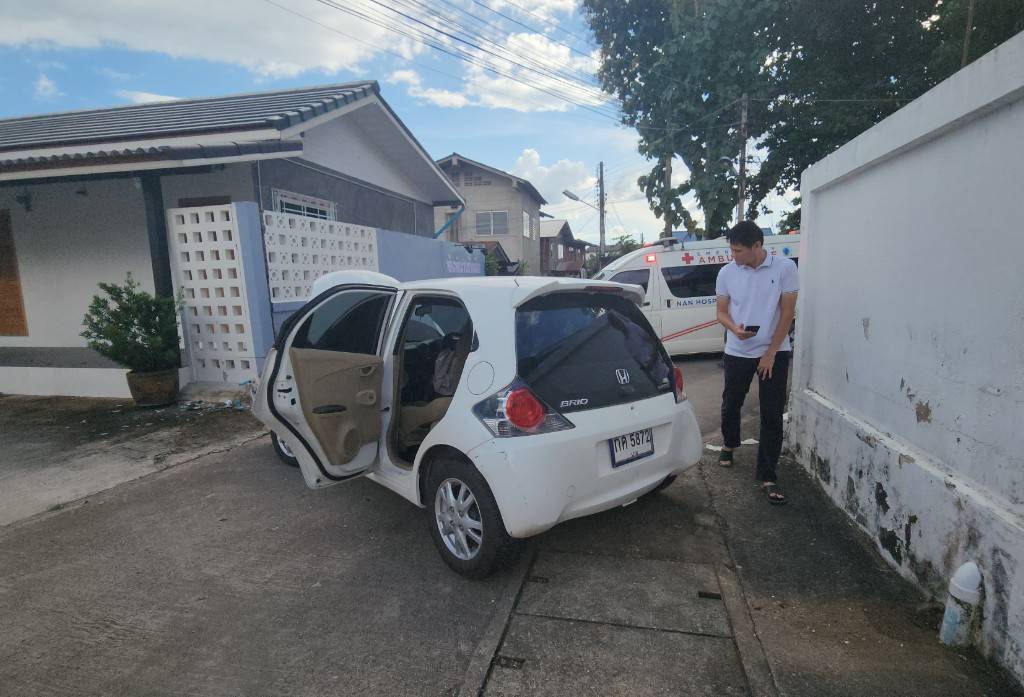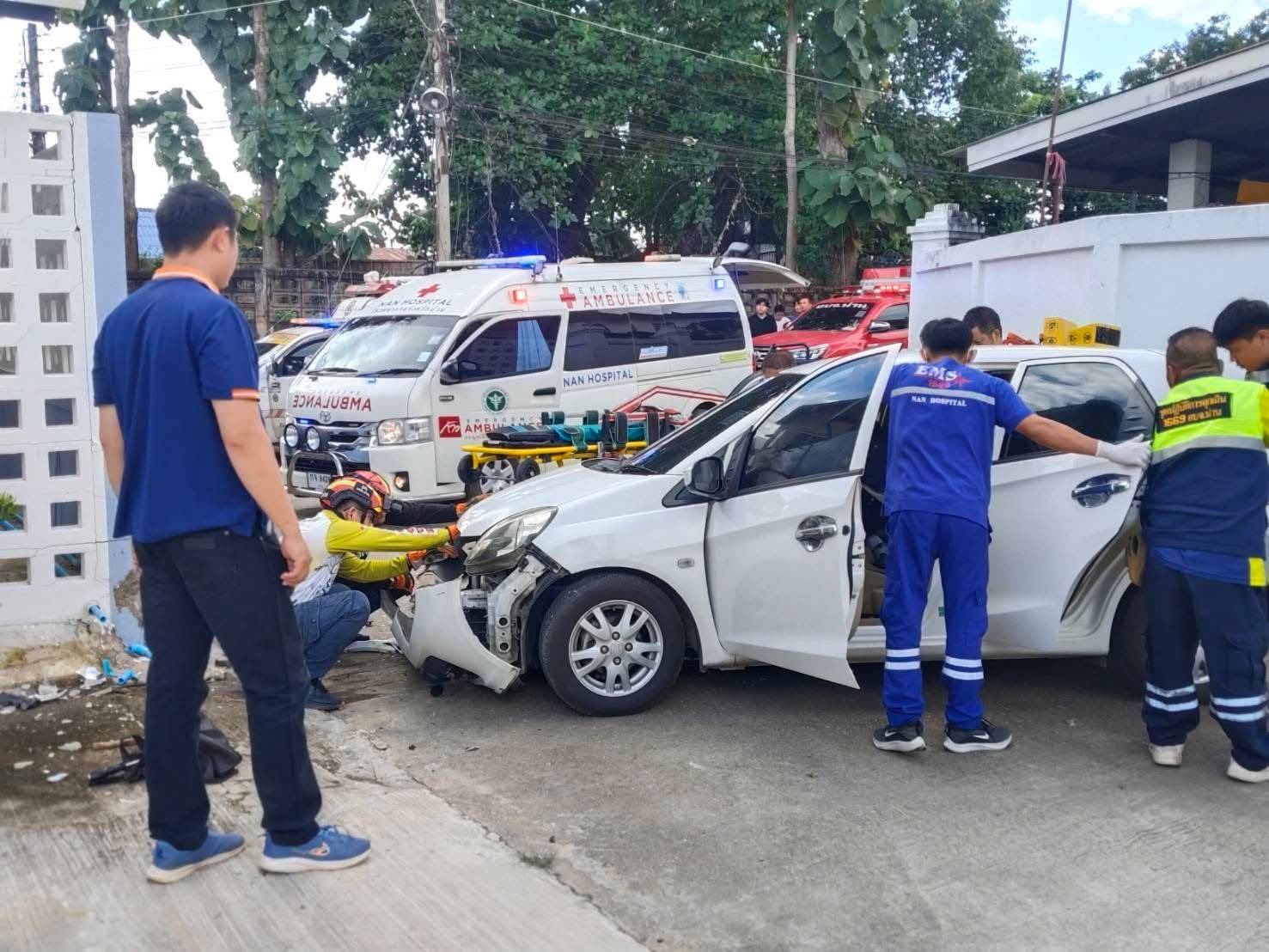 วันที่ 17 ตุลาคม 2568 เวลา 14.35 น.ร.ต.อ.ชวลิต เทรักสี พนักงานสอบสวน สภ.เมืองน่าน ได้รับแจ้งจากศูนย์วิทยุ 191 ว่าเกิดอุบัติเหตุรถยนต์เก๋งพุ่งชนกำแพงบ้าน บริเวณหลังวัดช้างเผือก ตำบลในเวียง อำเภอเมือง จังหวัดน่าน จึงรีบรุดไปตรวจสอบที่เกิดเหตุ ในที่เกิดเหตุพบเจ้าหน้าที่กู้ชีพนครน่าน (โรงพยาบาลน่าน) เจ้าหน้าที่กู้ชีพองค์การบริหารส่วนจังหวัดน่าน และเจ้าหน้าที่ฝ่ายป้องกันและบรรเทาสาธารณภัย อบจ.น่าน ร่วมกับเจ้าหน้าที่กู้ชีพน่าน กำลังให้การช่วยเหลือผู้บาดเจ็บเป็นชาย 1 ราย ติดอยู่ภายในห้องโดยสารฝั่งคนขับ