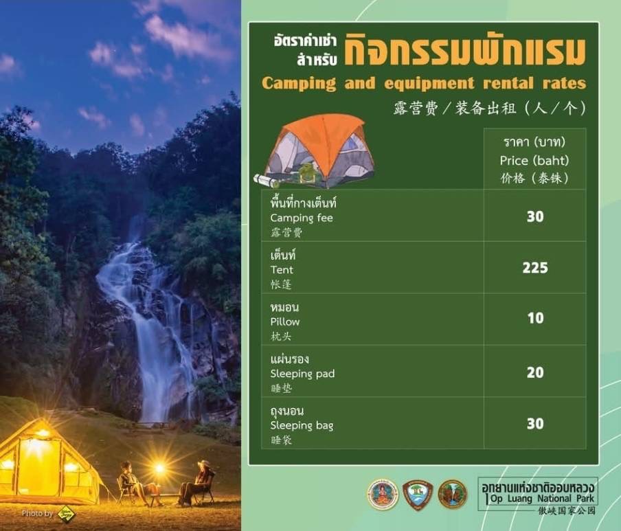 ค่าบริการและค่าเช่าอุปกรณ์แค้มปิ้ง นักท่องเที่ยวที่จะเดินทางไปท่องเที่ยวและพักแรมน้ำตกแม่เตี๊ยะ