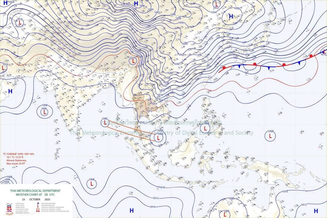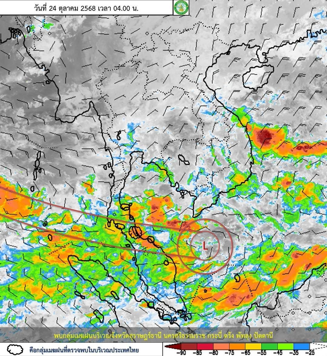 ลักษณะอากาศทั่วไป พยากรณ์อากาศ 24 ชั่วโมงข้างหน้า ภาคใต้ตอนล่างมีฝนตกหนักถึงหนักมากบางแห่ง ขอให้ประชาชนในบริเวณดังกล่าว โดยเฉพาะบริเวณจังหวัดนครศรีธรรมราช พัทลุง สงขลา ปัตตานี ตรัง และสตูล ระวังอันตรายจากฝนฟ้าคะนอง ฝนตกหนักถึงหนักมากและฝนที่ตกสะสม รวมทั้งเพิ่มความระมัดระวังในการสัญจรผ่านบริเวณที่มีน้ำท่วมขัง เนื่องจากร่องมรสุมกำลังปานกลางที่พาดผ่านภาคใต้ตอนล่างมีกำลังแรงขึ้น ประกอบกับมรสุมตะวันออกเฉียงเหนือกำลังปานกลางพัดปกคลุมอ่าวไทยตอนบน ภาคใต้ตอนบน และทะเลอันดามันตอนบน ส่วนคลื่นลมบริเวณอ่าวไทยตอนบนและห่างฝั่งของทะเลอันดามันมีกำลังปานกลาง โดยมีคลื่นสูง 1-2 เมตร บริเวณที่มีฝนฟ้าคะนองคลื่นสูงมากกว่า 2 เมตร อ่าวไทยตอนล่างและทะเลอันดามันตอนล่างมีคลื่นสูงประมาณ 1 เมตร บริเวณที่มีฝนฟ้าคะนองคลื่นสูงมากกว่า 2 เมตร ขอให้ชาวเรือบริเวณอ่าวไทยและทะเลอันดามันเดินเรือด้วยความระมัดระวัง และหลีกเลี่ยงการเดินเรือในบริเวณที่มีฝนฟ้าคะนอง