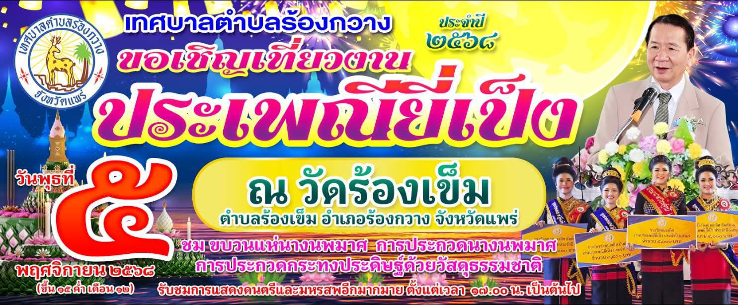 นายพิพัฒน์ ซื่อทรงธรรม นายกเทศมนตรีตำบลร้องกวาง อ.ร้องกวาง จ.แพร่ เผยว่า เทศบาลตำบลร้องกวาง ขอเชิญเที่ยวงานสืบสานประเพณียี่เป็ง ลอยกระทง ประจำปี 2568 ในวันพุธที่ 5 พฤศจิกายน 2568 ณ วัดร้องเข็ม ตำบลร้องเข็ม อำเภอร้องกวาง จังหวัดแพร