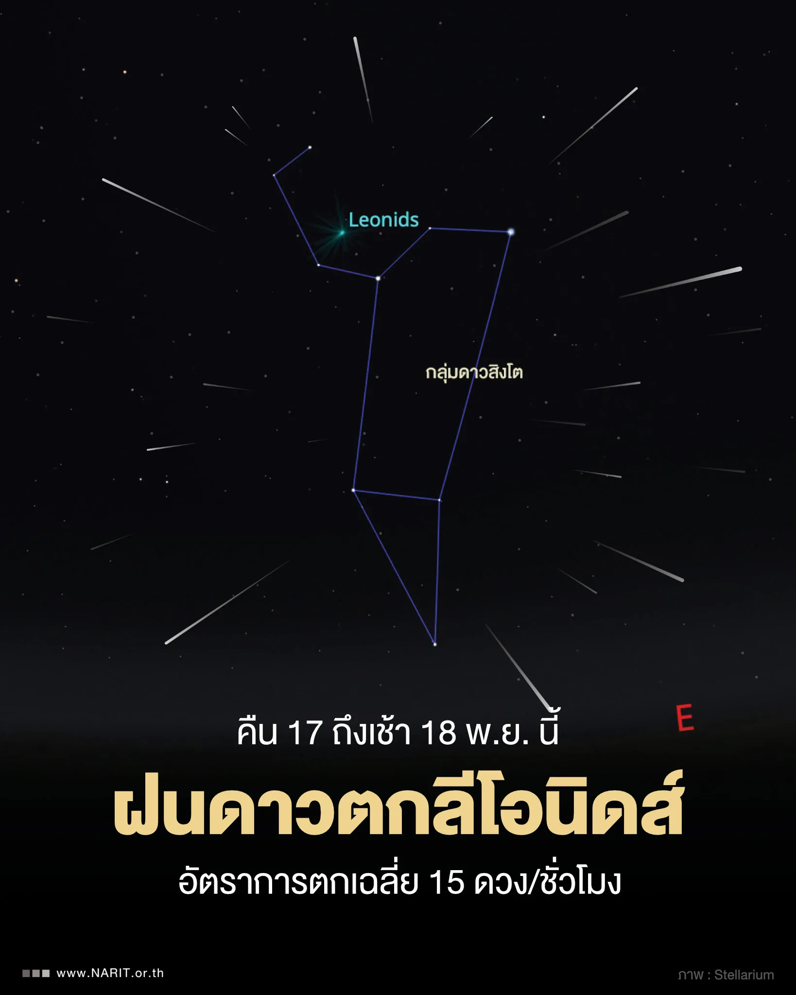 คืนวันที่ 17 ถึงรุ่งเช้า 18 พฤศจิกายน 2568 นี้ จะเกิดปรากฏการณ์ “ฝนดาวตกลีโอนิดส์” หรือ “ฝนดาวตกกลุ่มดาวสิงโต” อัตราการตกสูงสุดเฉลี่ย 15 ดวงต่อชั่วโมง มีศูนย์กลางการกระจายตัวของฝนดาวตกในกลุ่มดาวสิงโต แนะนำชมหลังเที่ยงคืนเป็นต้นไป