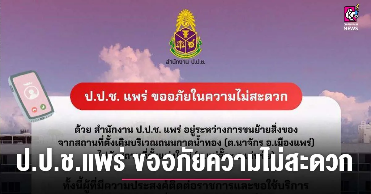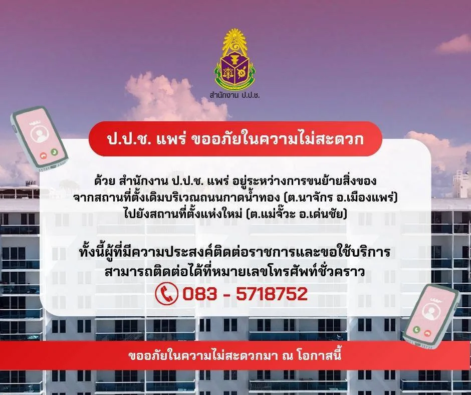 ป.ป.ช. แพร่ ขออภัยในความไม่สะดวกกับผู้ติดต่อราชการ และผู้มาขอใช้บริการทุกท่าน สำนักงาน ป.ป.ช. แพร่ แจ้งว่าสำนักงาน ป. ป.ช.แพร่อยู่ระหว่างการขนย้ายสิ่งของ จากสถานที่ตั้งเดิมบริเวณถนนกาดน้ำทอง (ต.นาจักร อ.เมืองแพร่) ไปยังสถานที่ตั้งแห่งใหม่ (ต.แม่จั๊วะ อ.เด่นชัย) ส่งผลให้ ยกเลิกการใช้งานของหมายเลขโทรศัพท์สำนักงานฯ เดิม 054 – 531343 เป็นที่เรียบร้อยแล้วทั้งนี้ผู้ที่มีความประสงค์ติดต่อราชการและขอใช้บริการ สามารถติดต่อหมายเลขโทรศัพท์ชั่วคราว สำนักงาน ป.ป.ช. ประจำจังหวัดแพร่ ได้ที่ โทร083 – 5718752