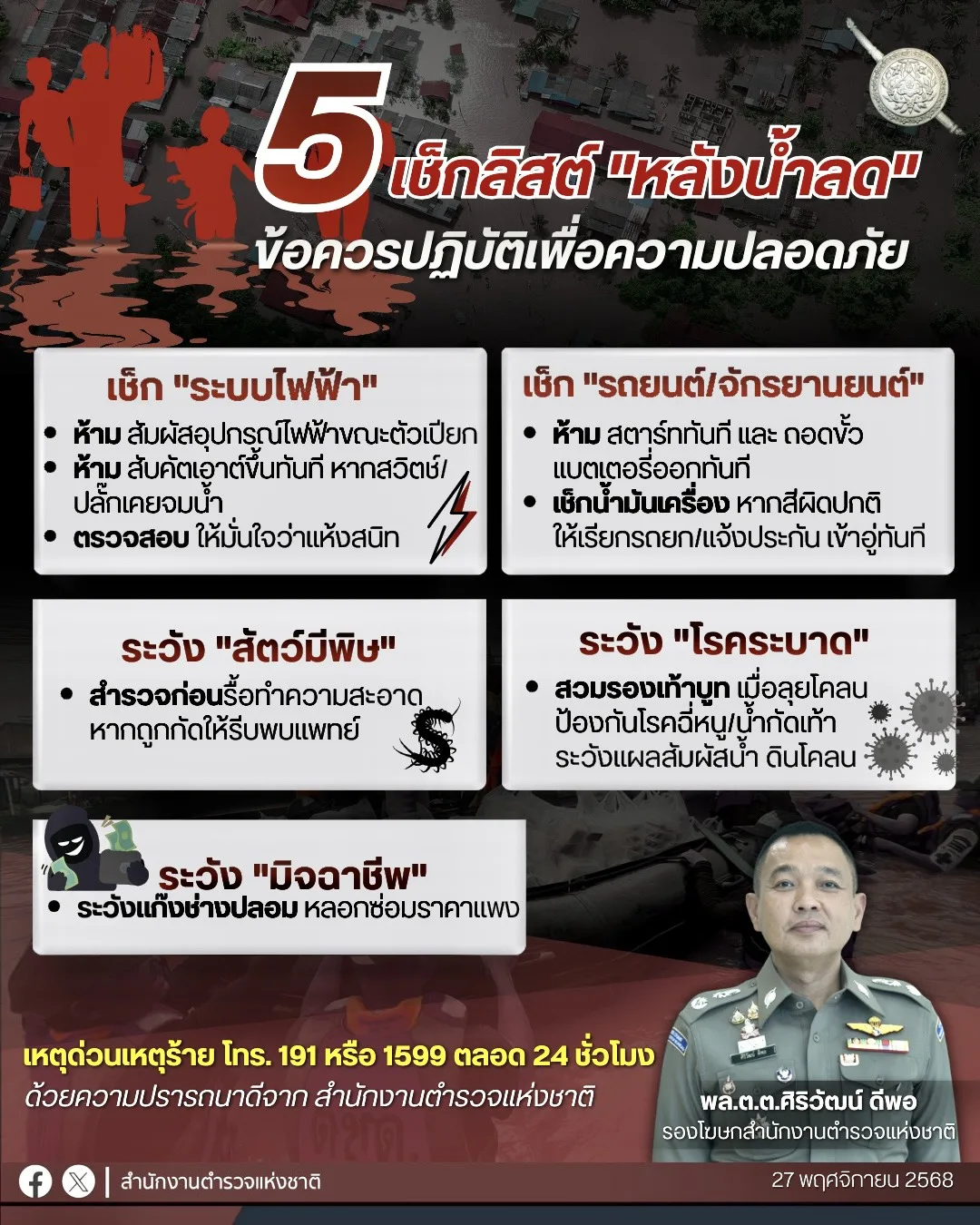 วันนี้ 27 พฤศจิกายน 2568 พล.ต.ต.ศิริวัฒน์ ดีพอ รองโฆษกสำนักงานตำรวจแห่งชาติ เปิดเผยว่า สำนักงานตำรวจแห่งชาติมีความห่วงใยพี่น้องประชาชนจากสถานการณ์อุทกภัยในพื้นที่ภาคใต้ ที่เริ่มคลี่คลายในบางพื้นที่ โดยพบว่าในช่วง “หลังน้ำลด” มักเกิดอุบัติเหตุจากการถูกไฟฟ้าดูด และความเสียหายต่อทรัพย์สินโดยเฉพาะรถยนต์จากการรู้เท่าไม่ถึงการณ์ รวมถึงภัยสุขภาพ และมิจฉาชีพที่อาจเข้ามาซ้ำเติมความเดือดร้อน