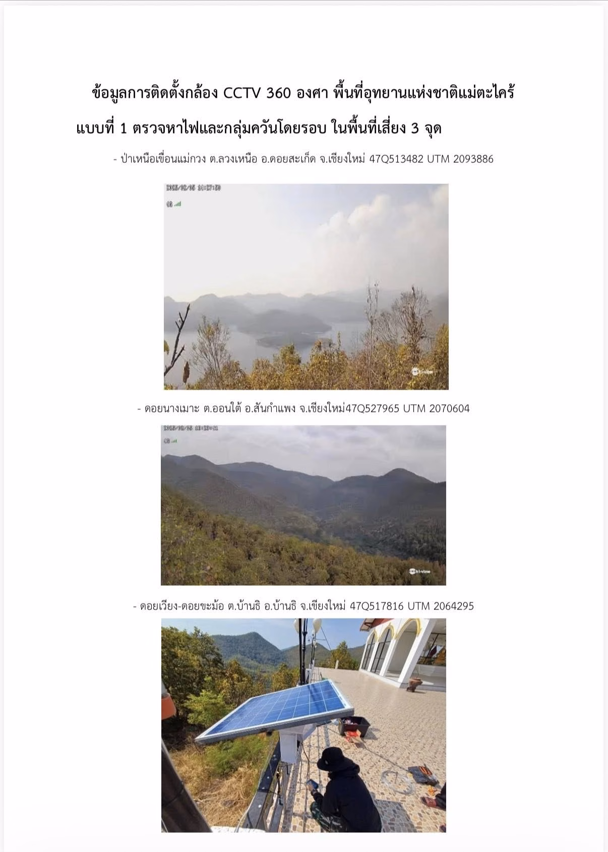 1. ตรวจหาไฟและกลุ่มควันแบบ Real-time: ติดตั้งในพื้นที่เสี่ยง 3 จุด ได้แก่ ป่าเหนือเขื่อนแม่กวง (ดอยสะเก็ด), ดอยนางเมาะ (สันกำแพง) และดอยเวียง-ดอยขะม้อ (บ้านธิ) เพื่อส่งข้อมูลภาพไปยังศูนย์ควบคุมทันทีที่พบความผิดปกติ