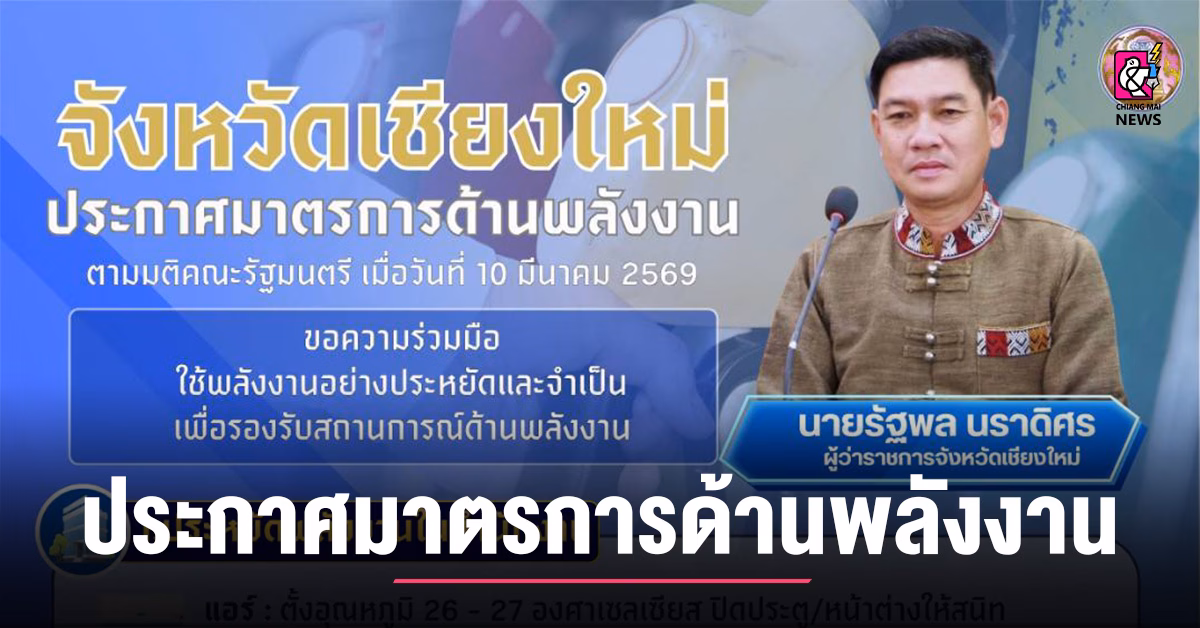 ตามมติคณะรัฐมนตรี เมื่อวันที่ 10 มีนาคม 2569 นายรัฐพล นราดิศร ผู้ว่าราชการจังหวัดเชียงใหม่ ขอความร่วมมือทุกภาคส่วนในการใช้พลังงานอย่างประหยัดและจำเป็น เพื่อรองรับสถานการณ์ด้านพลังงาน โดยมีแนวทางปฏิบัติ 3 ด้าน ดังนี้