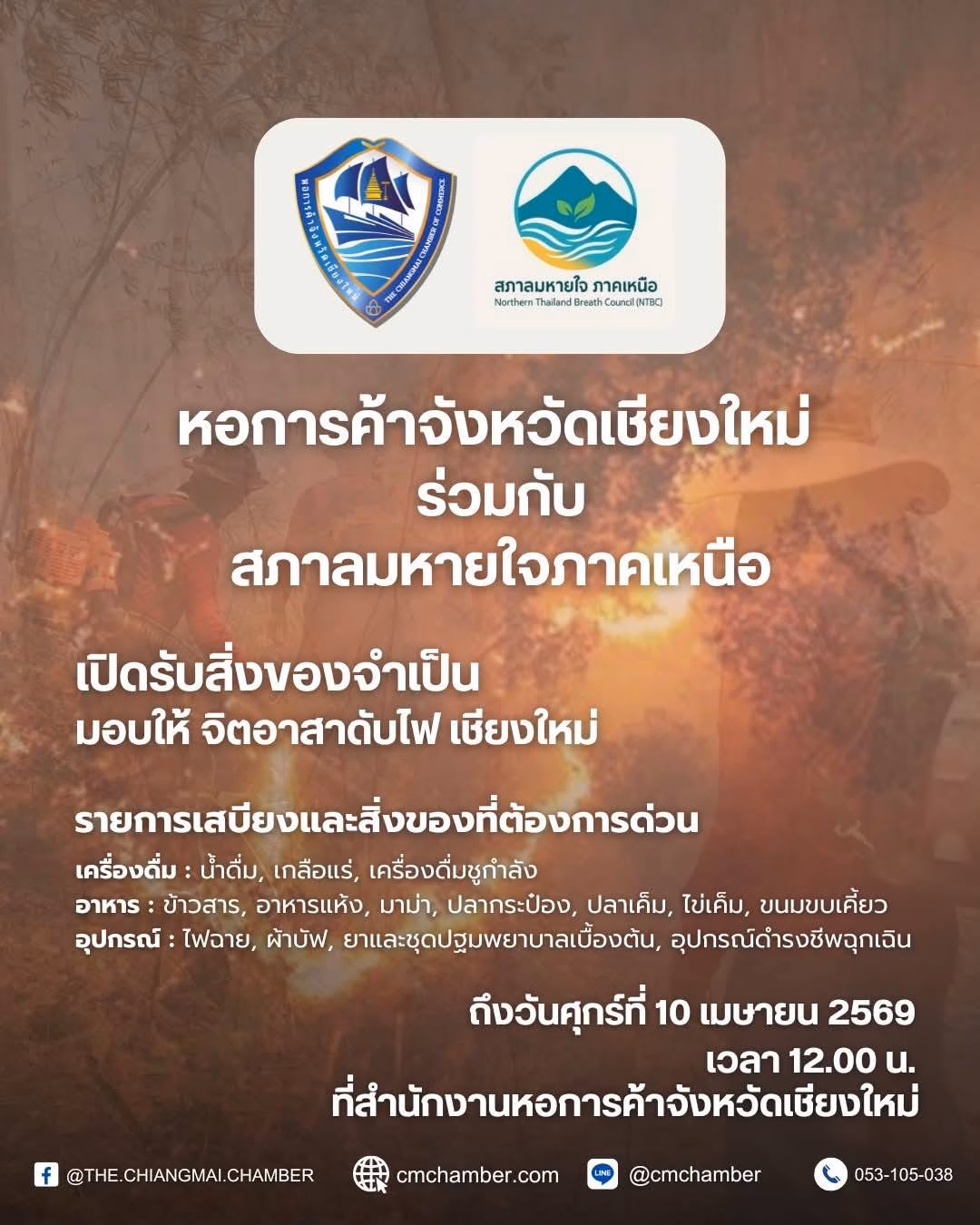 เนื่องต่อจาก การส่งมอบของบริจาคที่ผ่านมา วิกฤตไฟป่ายังคงน่าเป็นห่วง! เจ้าหน้าที่และจิตอาสากำลังทำงานกันอย่างหนัก หอการค้าจังหวัดเชียงใหม่ ขอเชิญชวนชาวเชียงใหม่และผู้ที่สนใจ ร่วมส่งต่อกำลังใจผ่านการสนับสนุนสิ่งของจำเป็น เพื่อส่งตรงถึงแนวหน้าผู้พิทักษ์ของเรา