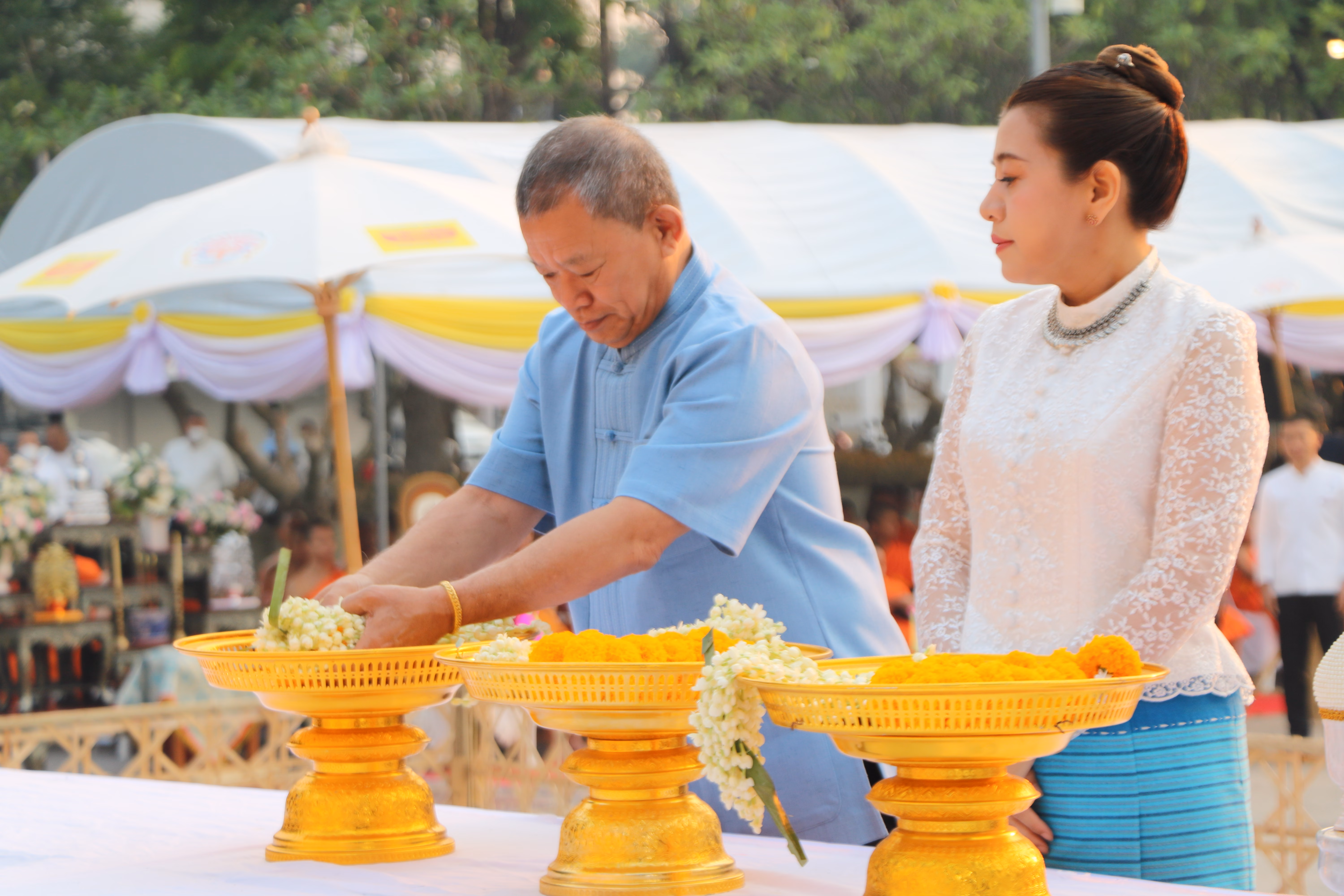 ในส่วนของฝ่ายฆราวาส ได้รับเกียรติจาก รัฐพล นราดิศร ผู้ว่าราชการจังหวัดเชียงใหม่ เป็นประธานในพิธี นำจุดธูปเทียนบูชาพระรัตนตรัย และประกอบพิธีถวายขันขอศีลต่อประธานสงฆ์ พร้อมถวายพวงมาลัยจำนวน ๓ ชุด และจุดเครื่องทองน้อยเบื้องหน้าพระบรมราชานุสาวรีย์สามกษัตริย์ เพื่อแสดงความสักการะและรำลึกถึงพระมหากรุณาธิคุณแห่งบูรพกษัตริย์ผู้ทรงสถาปนาเมืองเชียงใหม่