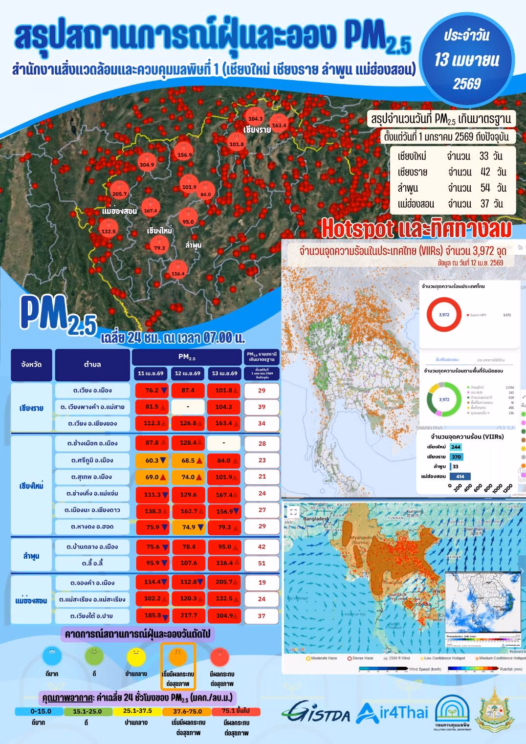 📢 สรุปสถานการณ์ฝุ่น PM2.5 เฉลี่ย 24 ชั่วโมง ณ เวลา 07.00 น. ประจำวันที่ 13 เมษายน 2569 ในพื้นที่รับผิดชอบของสำนักงานสิ่งแวดล้อมและควบคุมมลพิษที่ 1 (เชียงใหม่ เชียงราย ลำพูน แม่ฮ่องสอน)