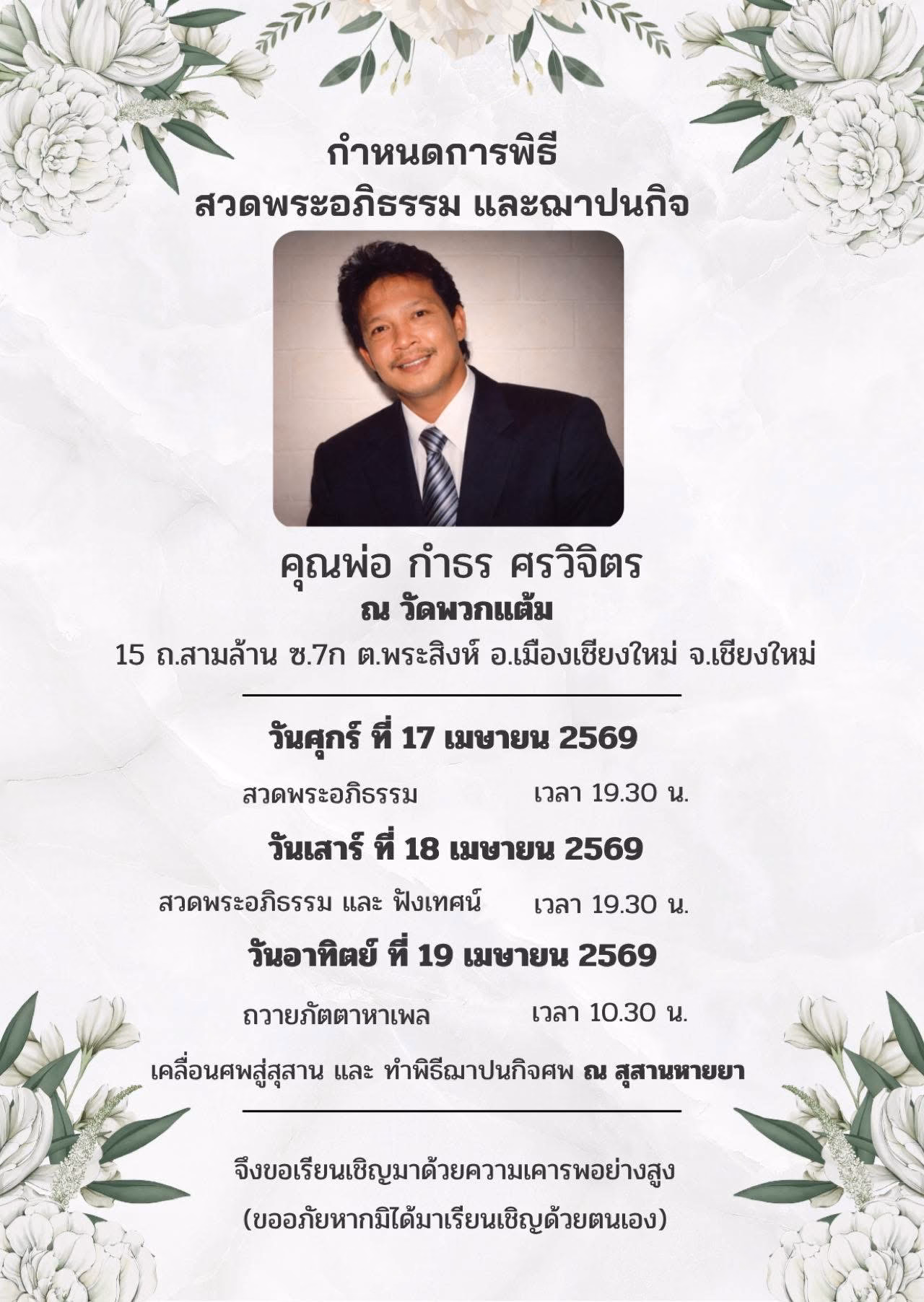 ข่าวคืบหน้า ทางลูกชายของนายกำธร ศรวิจิตร ได้โพสต์กำหนดการพิธีงานศพของพ่อ โดยกำหนดการพิธี สวดพระอภิธรรม และฌาปนกิจ คุณพ่อกำธร ศรวิจิตร ณ วัดพวกแต้ม อ .เมืองเชียงใหม่