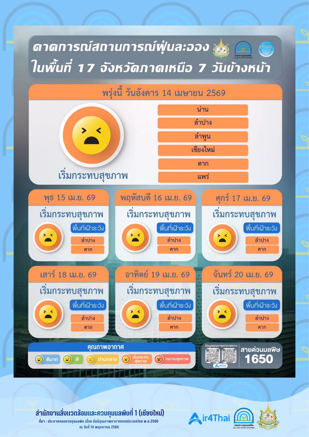 📢 สรุปสถานการณ์ฝุ่น PM2.5 เฉลี่ย 24 ชั่วโมง ณ เวลา 07.00 น. ประจำวันที่ 14 เมษายน 2569 ในพื้นที่รับผิดชอบของสำนักงานสิ่งแวดล้อมและควบคุมมลพิษที่ 1 (เชียงใหม่ เชียงราย ลำพูน แม่ฮ่องสอน)